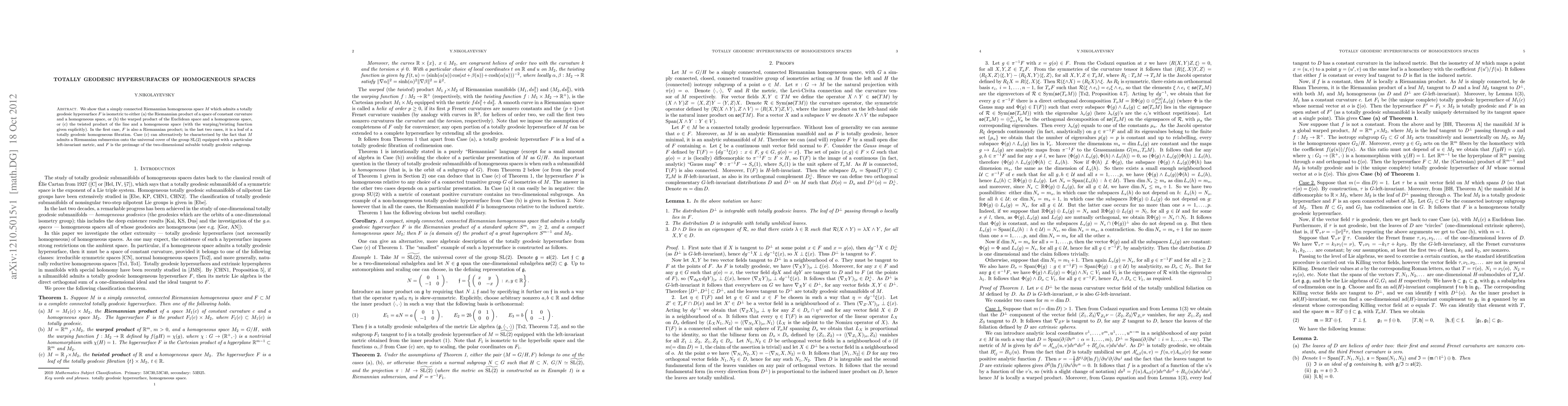 This paper demonstrates that a simply connected Riemannian homogeneous space with a totally geodesic hypersurface is isometric to a Riemannian product of a space of constant curvature or a warped/twisted product of Euclidean and homogeneous spaces, with specific characterizations for each case.