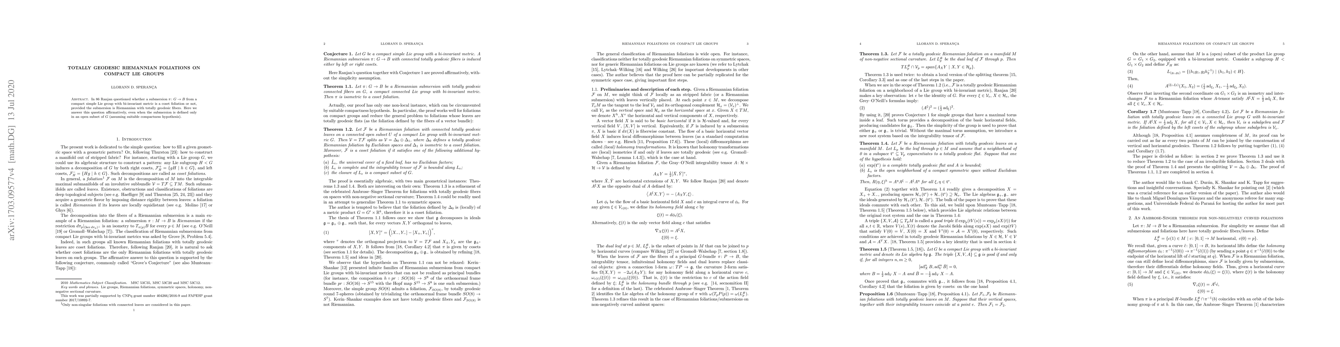 Summary: The paper affirms that a Riemannian submersion from a compact simple Lie group with totally geodesic fibers is a coset foliation, even when defined only in an open subset, under appropriate conditions. This resolves Ranjan's 1986 question on the nature of such submersions.