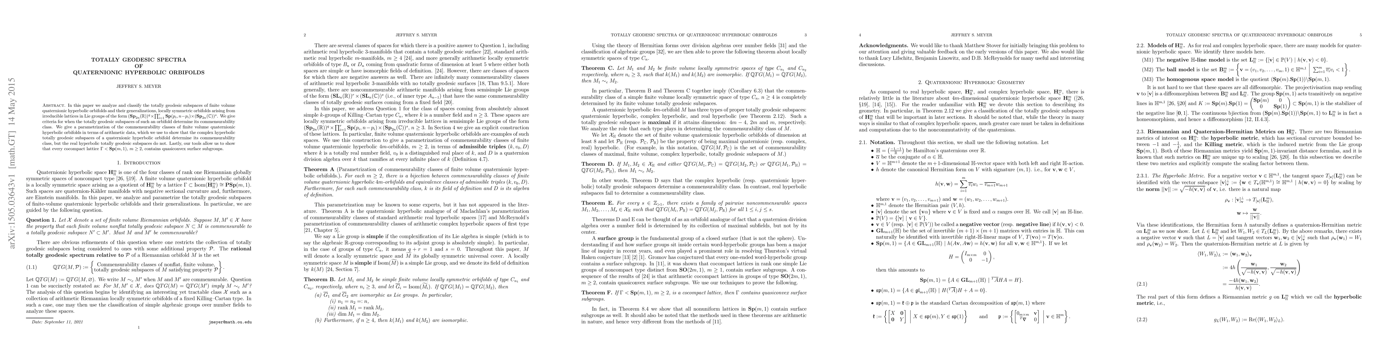 This paper classifies totally geodesic subspaces of finite volume quaternionic hyperbolic orbifolds and their generalizations, establishing criteria for their commensurability class determination. It also shows that complex hyperbolic subspaces determine the orbifold's commensurability class, while real hyperbolic ones do not.