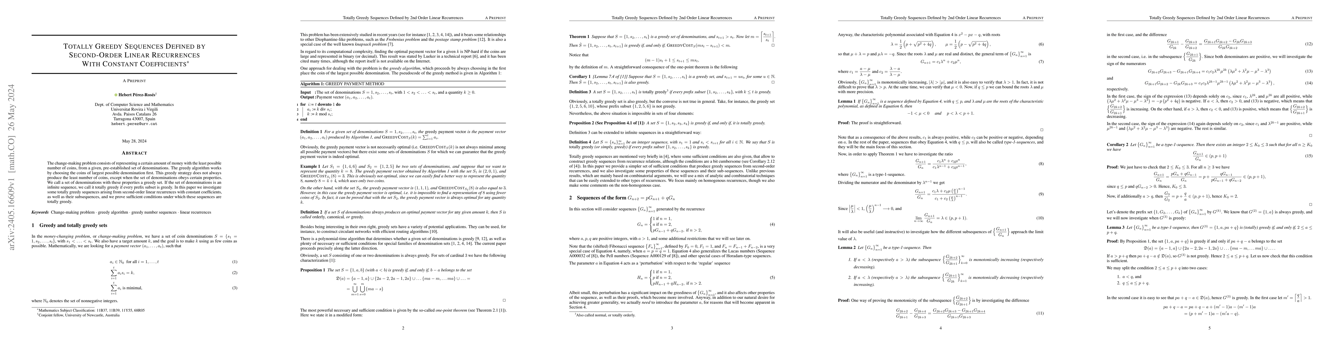 This paper explores totally greedy sequences derived from second-order linear recurrences with constant coefficients, proving conditions that ensure these sequences are totally greedy, where every prefix subset exhibits the greedy property in the change-making problem.