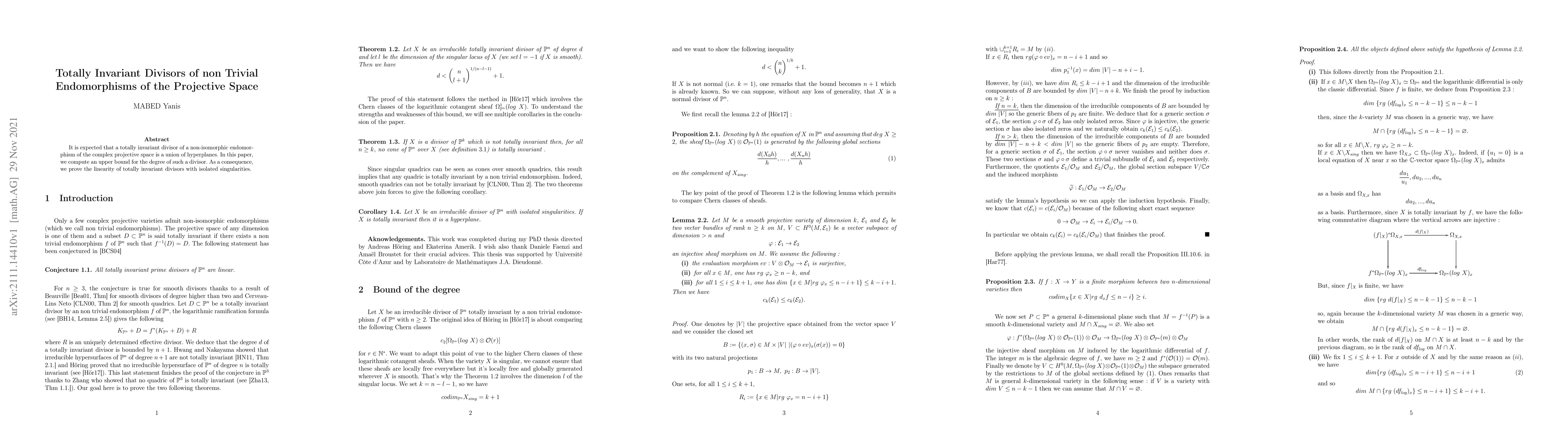 This paper computes an upper bound for the degree of a totally invariant divisor of a non-trivial endomorphism of complex projective space, proving that such divisors are linear combinations of hyperplanes with isolated singularities.
