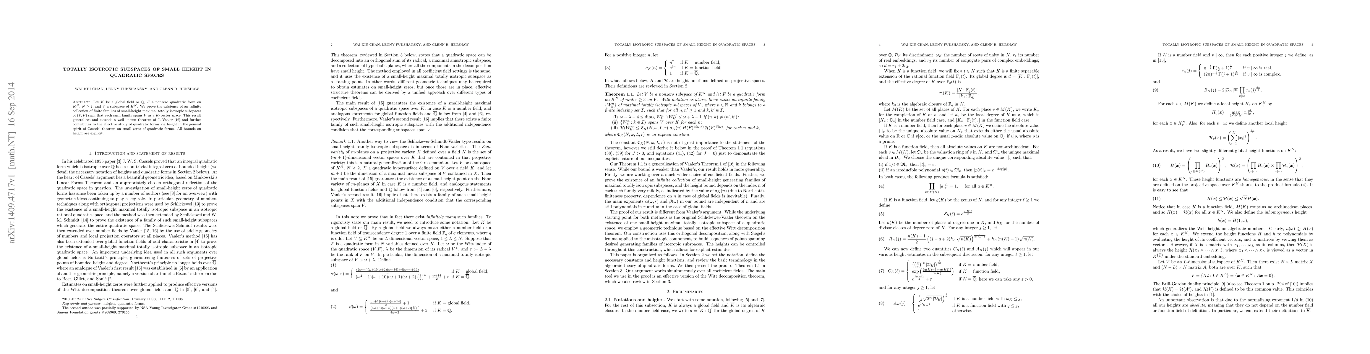 Let $K$ be a global field or $\overline{\mathbb Q}$, $F$ a nonzero quadratic form on $K^N$, $N \geq 2$, and $V$ a subspace of $K^N$. We prove the existence of an infinite collection of finite families of small-height maximal totally isotropic subspaces of $(V,F)$ such that each such family spans $V$ as a $K$-vector space. This result generalizes and extends a well known theorem of J. Vaaler and further contributes to the effective study of quadratic forms via height in the general spirit of Cassels' theorem on small zeros of quadratic forms. All bounds on height are explicit.