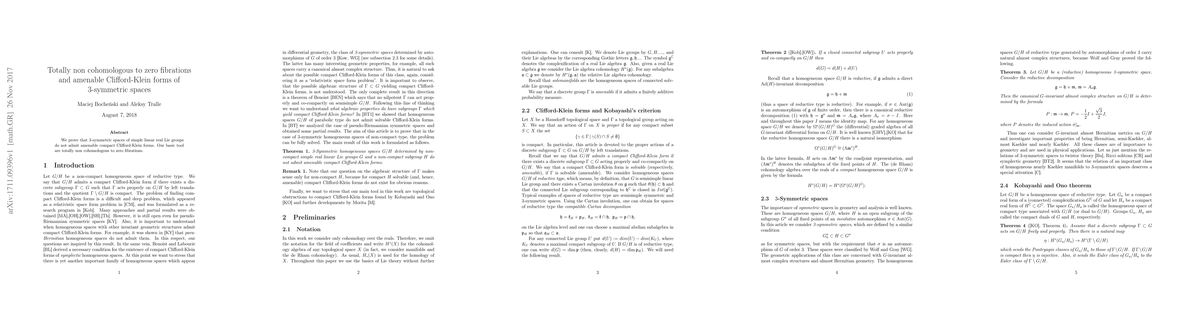 We prove that 3-symmetric spaces of simple linear real Lie groups do not admit amenable compact Clifford-Klein forms. Our basic tool are totally non cohomologous to zero fibrations.