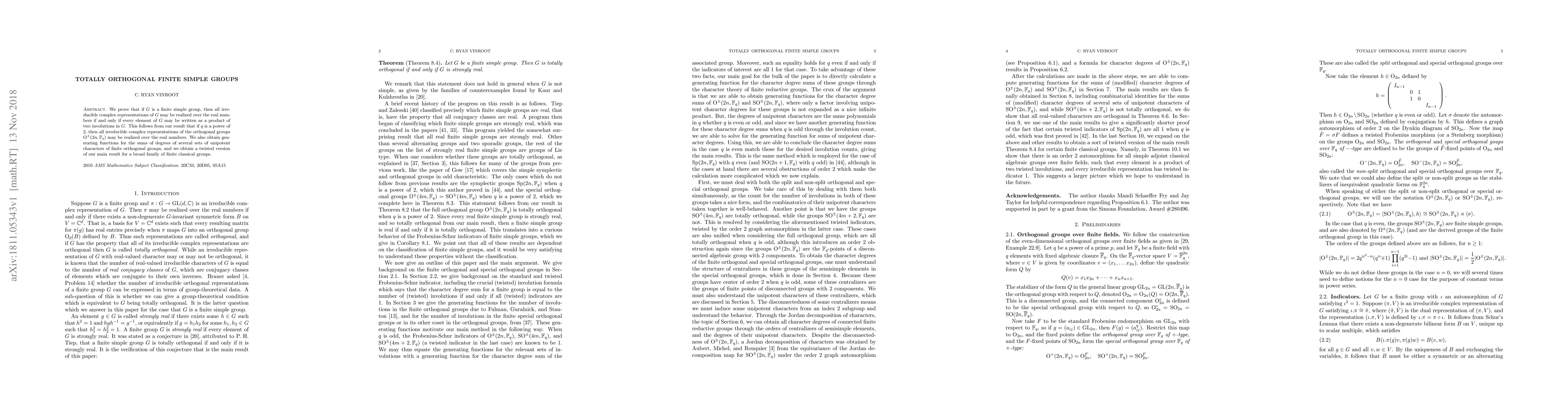 This paper proves that finite simple groups can be represented over the real numbers if every element can be expressed as a product of two involutions. The proof also extends to showing that all irreducible complex representations of orthogonal groups over fields of characteristic 2 can be realized over the real numbers.