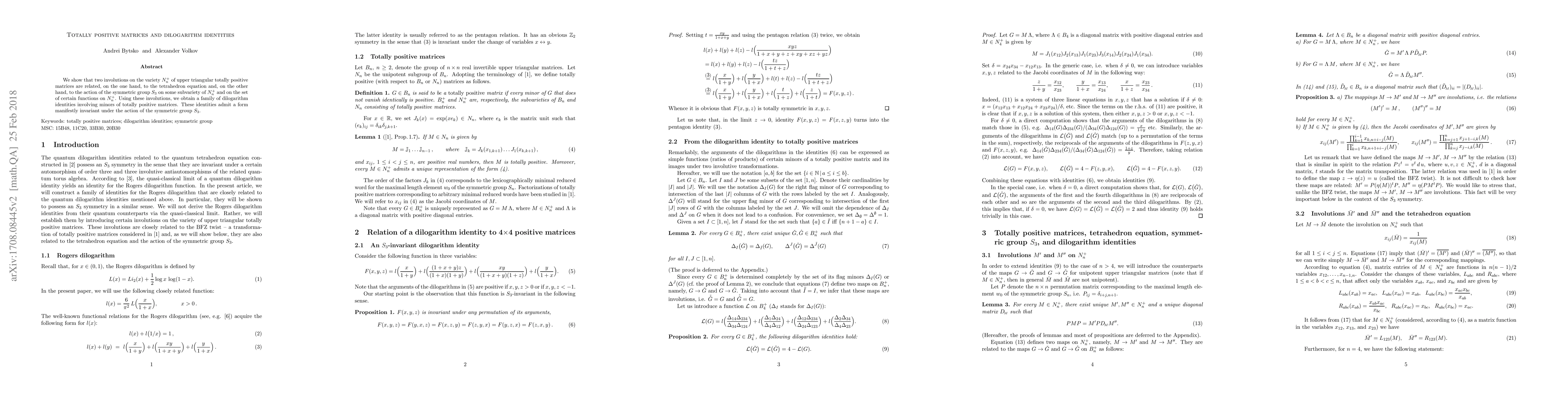 We show that two involutions on the variety $N_n^+$ of upper triangular totally positive matrices are related, on the one hand, to the tetrahedron equation and, on the other hand, to the action of the symmetric group $S_3$ on some subvariety of $N_n^+$ and on the set of certain functions on $N_n^+$. Using these involutions, we obtain a family of dilogarithm identities involving minors of totally positive matrices. These identities admit a form manifestly invariant under the action of the symmetric group $S_3$.