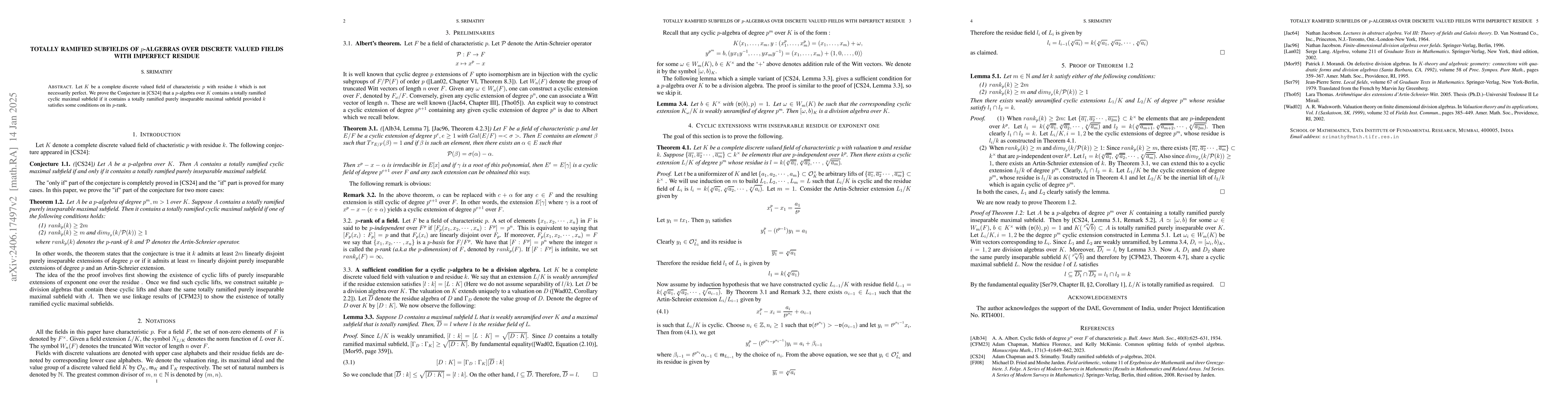 Let $K$ be a complete discrete valued field of characteristic $p$ with residue $k$ which is not necessarily perfect. We prove the Conjecture in \cite{cs} that a $p$-algebra over $K$ contains a totally ramified cyclic maximal subfield if it contains a totally ramified purely inseparable maximal subfield provided $k$ satisfies some conditions on its $p$-rank.