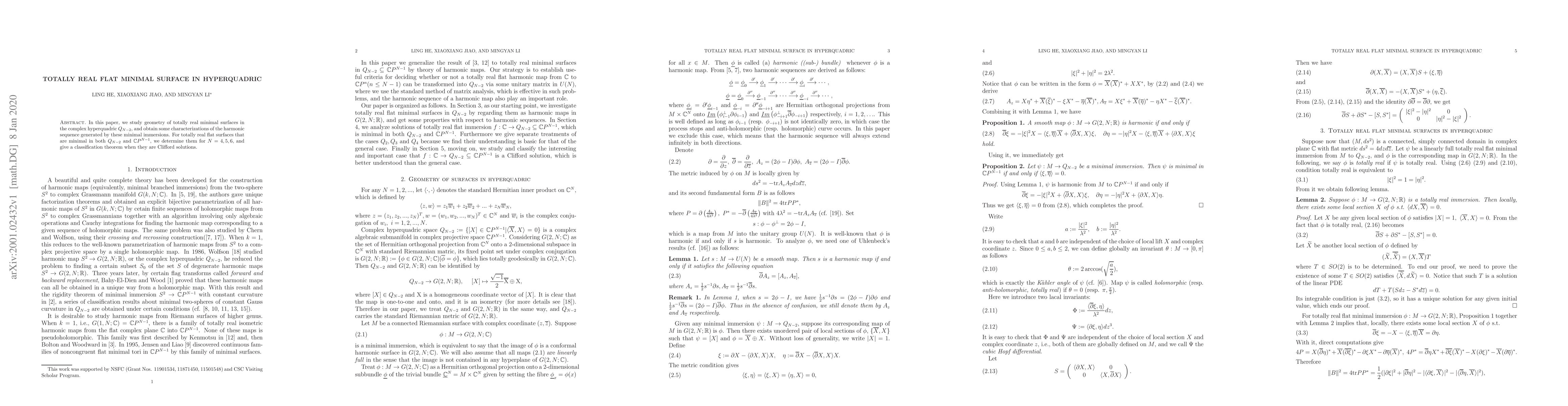 This paper characterizes totally real flat minimal surfaces in complex hyperquadrics, focusing on their harmonic sequences. It classifies such minimal surfaces for $N=4, 5, 6$ and presents a theorem for their Clifford solutions.