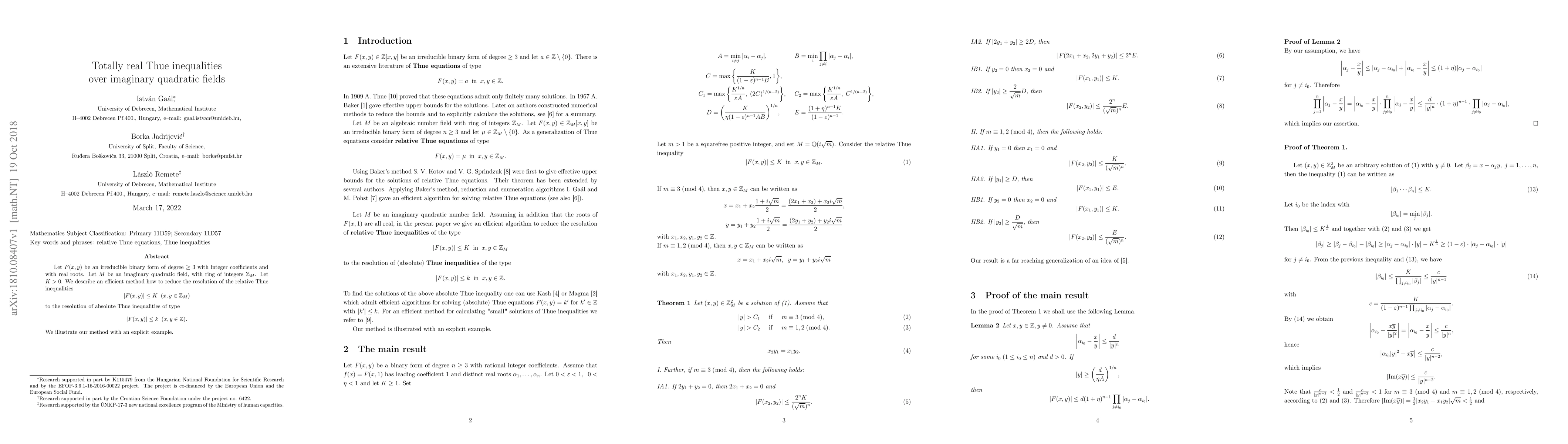 Let $F(x,y)$ be an irreducible binary form of degree $\geq 3$ with integer coefficients and with real roots. Let $M$ be an imaginary quadratic field, with ring of integers $Z_M$. Let $K>0$. We describe an efficient method how to reduce the resolution of the relative Thue inequalities \[ |F(x,y)|\leq K \;\; (x,y\in Z_M) \] to the resolution of absolute Thue inequalities of type \[ |F(x,y)|\leq k \;\; (x,y\in Z). \] We illustrate our method with an explicit example.