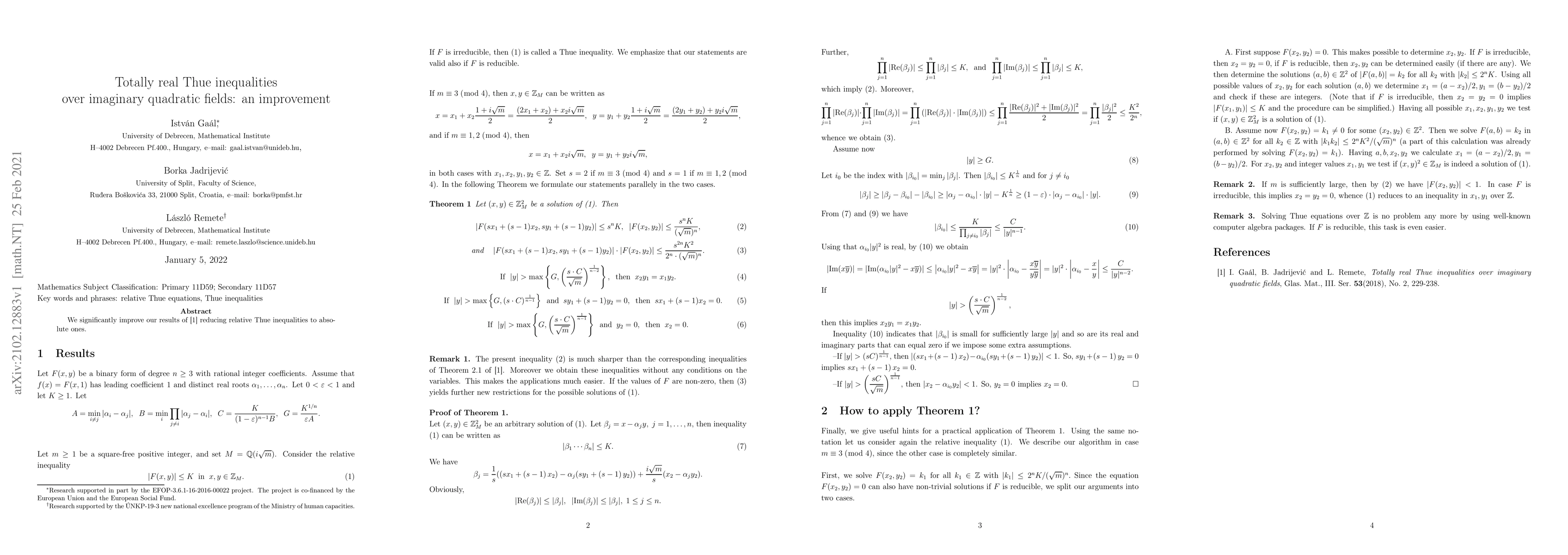 Summary: This paper enhances previous results on totally real Thue inequalities over imaginary quadratic fields by converting relative Thue inequalities into absolute ones, thereby improving the overall effectiveness of the analysis.