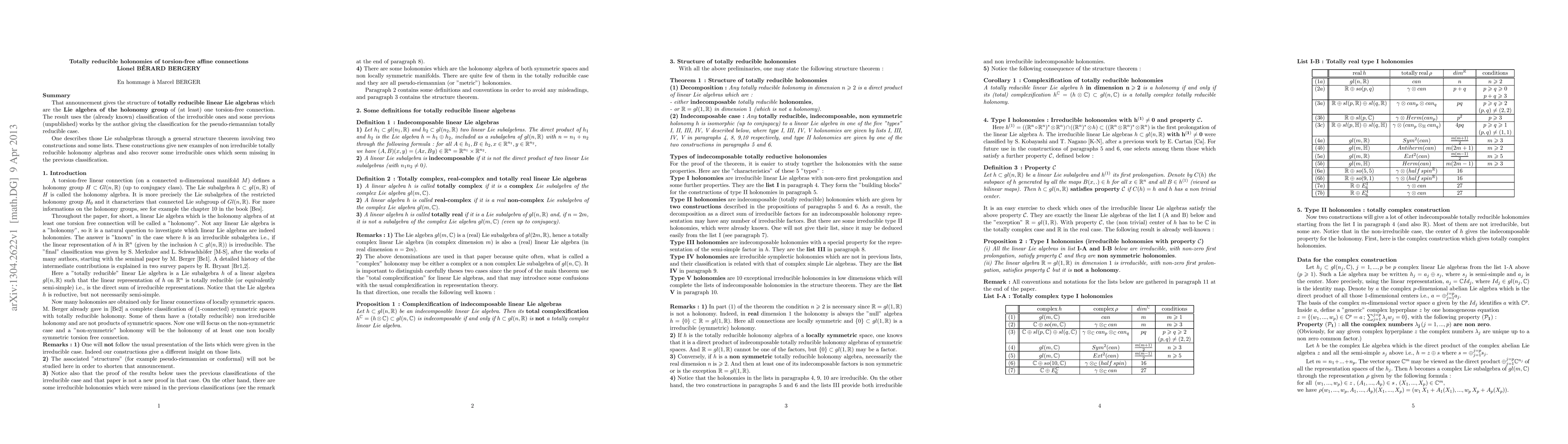 That announcement gives the structure of totally reducible linear Lie algebras which are the Lie algebra of the holonomy group of (at least) one torsion-free connection. The result uses the (already known) classi cation of the irreducible ones and some previous (unpublished) works by the author giving the classi cation for the pseudo-riemannian totally reducible case. One describes those Lie subalgebras through a general structure theorem involving two constructions and some lists. These constructions give new examples of non irreducible totally reducible holonomy algebras and also recover some irreducible ones which seem missing in the previous classi cation.