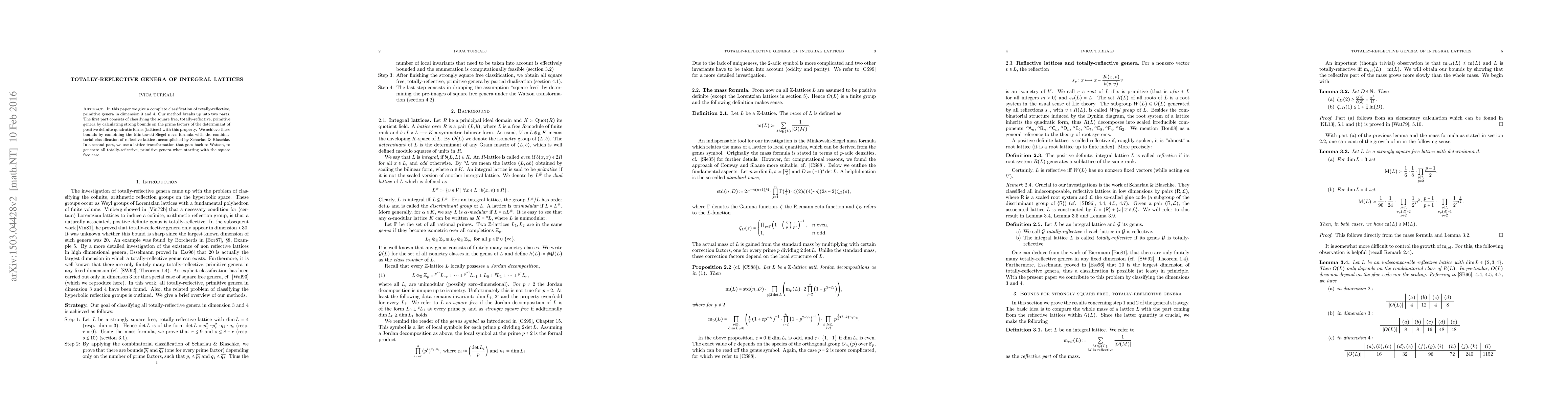 This paper classifies totally-reflective, primitive genera of integral lattices in dimensions 3 and 4 by combining the Minkowski-Siegel mass formula with combinatorial methods and a lattice transformation, achieving strong bounds on prime factors of determinants. It extends the classification from square-free cases to all genera using a transformation from Watson.