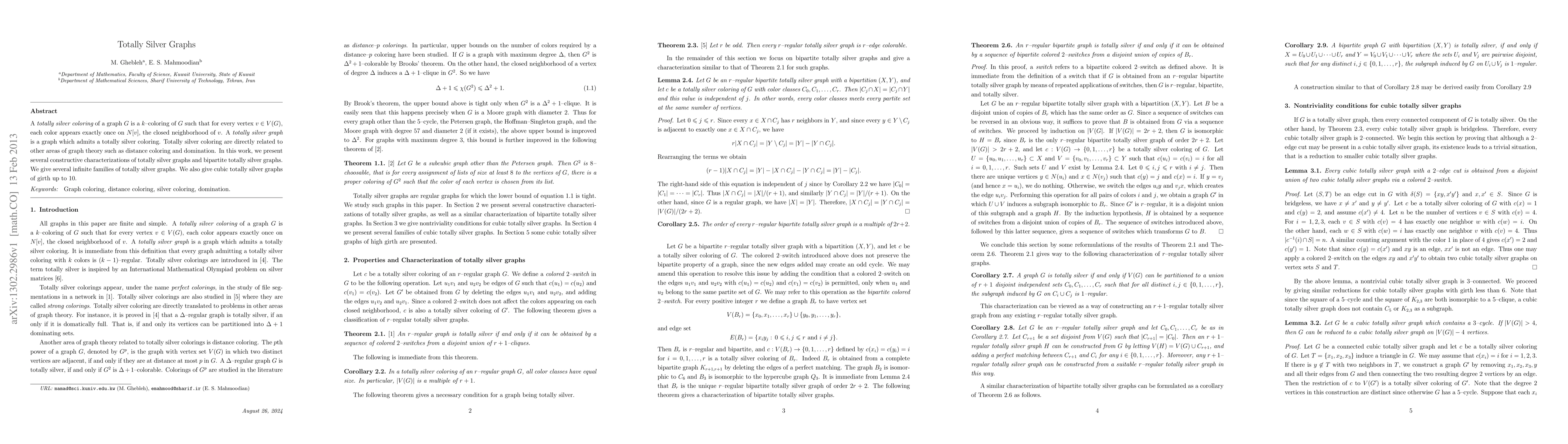 A totally silver coloring of a graph G is a k--coloring of G such that for every vertex v \in V(G), each color appears exactly once on N[v], the closed neighborhood of v. A totally silver graph is a graph which admits a totally silver coloring. Totally silver coloring are directly related to other areas of graph theory such as distance coloring and domination. In this work, we present several constructive characterizations of totally silver graphs and bipartite totally silver graphs. We give several infinite families of totally silver graphs. We also give cubic totally silver graphs of girth up to 10.