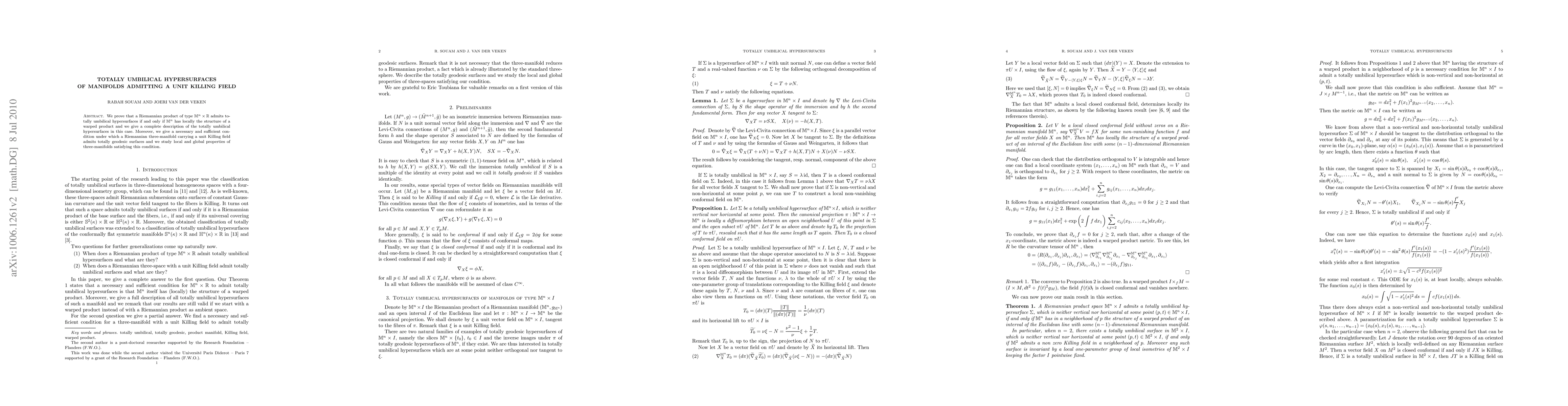 The paper proves that Riemannian product spaces of the form M x R have totally umbilical hypersurfaces if and only if M possesses a warped product structure, and describes these hypersurfaces. It also establishes a necessary and sufficient condition for three-manifolds with a unit Killing field to contain totally geodesic surfaces, along with a study of their local and global properties.