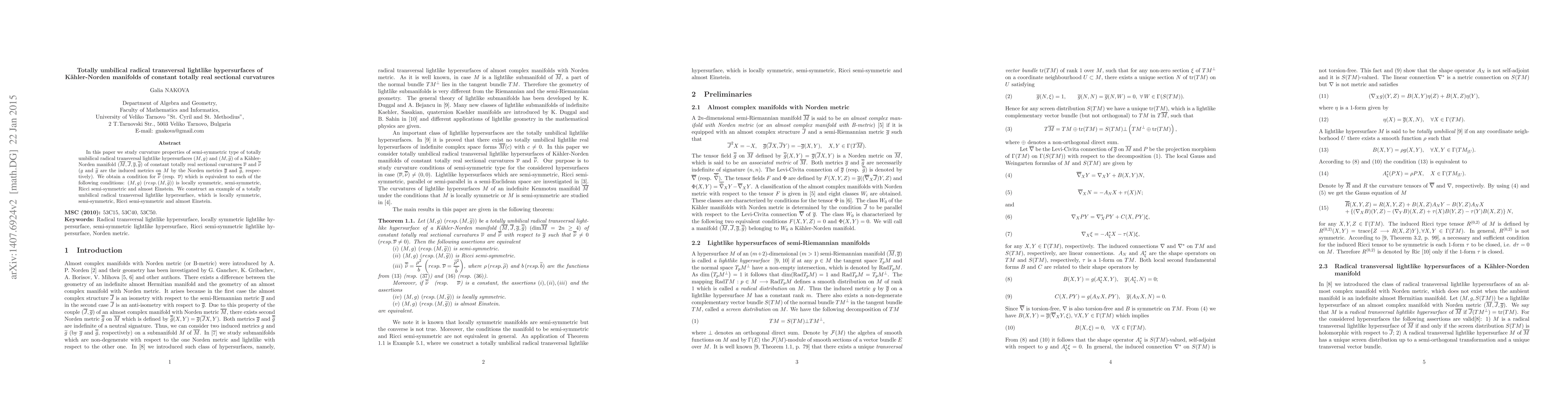 In this paper we study curvature properties of semi-symmetric type of totally umbilical radical transversal lightlike hypersurfaces $(M,g)$ and $(M,\widetilde g)$ of a K\"ahler-Norden manifold $(\overline M,\overline J,\overline g,\overline {\widetilde g})$ of constant totally real sectional curvatures $\overline \nu$ and $\overline {\widetilde \nu}$ ($g$ and $\widetilde g$ are the induced metrics on $M$ by the Norden metrics $\overline g$ and $\overline {\widetilde g}$,respectively). We obtain a condition for $\overline {\widetilde \nu}$ (resp. $\overline \nu$) which is equivalent to each of the following conditions: $(M,g)$ $(resp.\, (M,\widetilde g))$ is locally symmetric, semi-symmetric, Ricci semi-symmetric and almost Einstein. We construct an example of a totally umbilical radical transversal lightlike hypersurface, which is locally symmetric, semi-symmetric, Ricci semi-symmetric and almost Einstein.