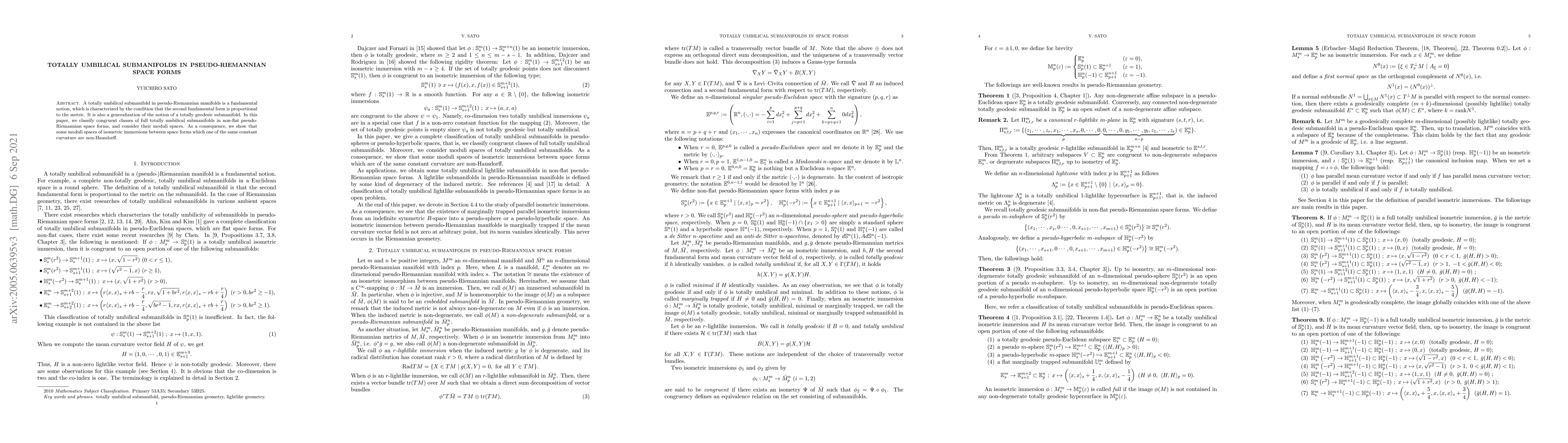 A totally umbilical submanifold in pseudo-Riemannian manifolds is a fundamental notion, which is characterized by the condition that the second fundamental form is proportional to the metric. It is also a generalization of the notion of a totally geodesic submanifold. In this paper, we classify congruent classes of full totally umbilical submanifolds in non-flat pseudo-Riemannian space forms, and consider their moduli spaces. As a consequence, we show that some moduli spaces of isometric immersions between space forms which one of the same constant curvature are non-Hausdorff.