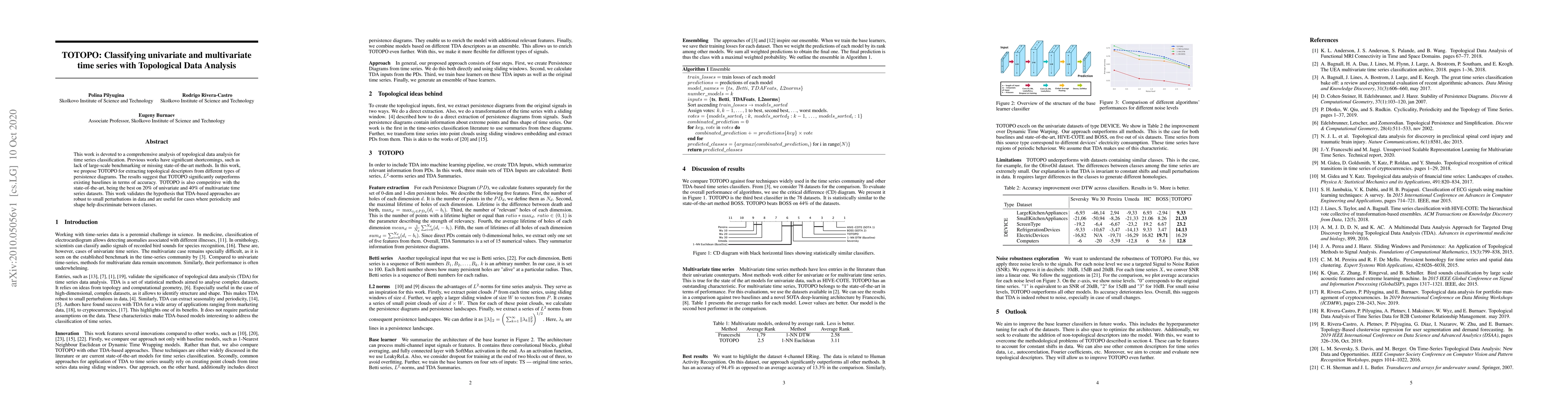 This work stands out by integrating topological data analysis into time series classification, proposing TOTOPO, and validating its robustness and performance on a diverse set of univariate and multivariate time series datasets, outperforming existing baselines and being competitive with state-of-the-art methods.