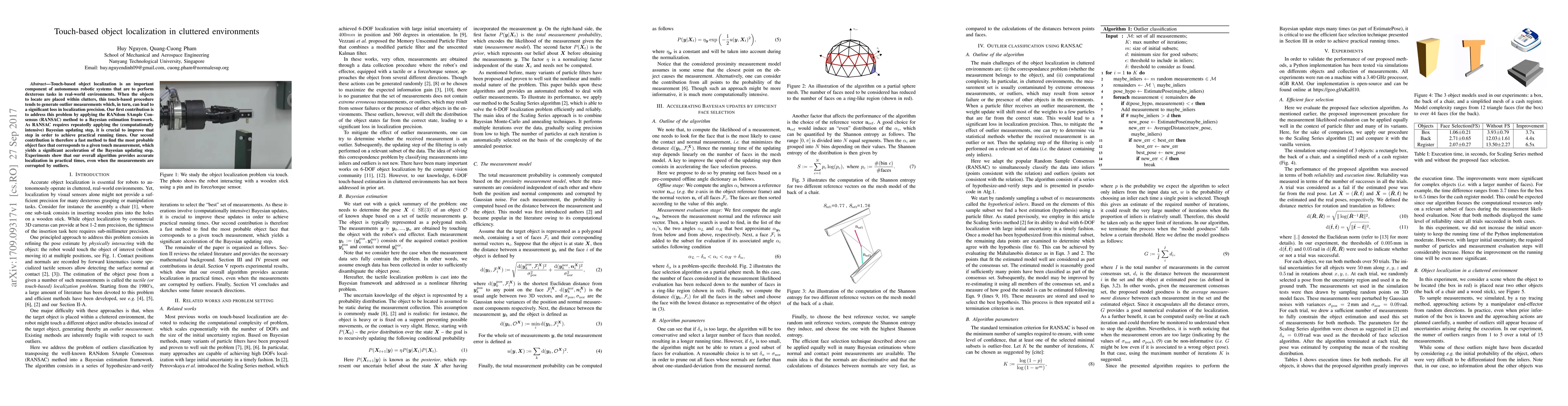 This paper proposes an improved RANSAC algorithm within a Bayesian framework to enhance touch-based object localization in cluttered environments, addressing the issue of outlier measurements. It introduces a fast method to accelerate the computationally intensive Bayesian updating step, achieving accurate localization in practical times despite measurement noise.