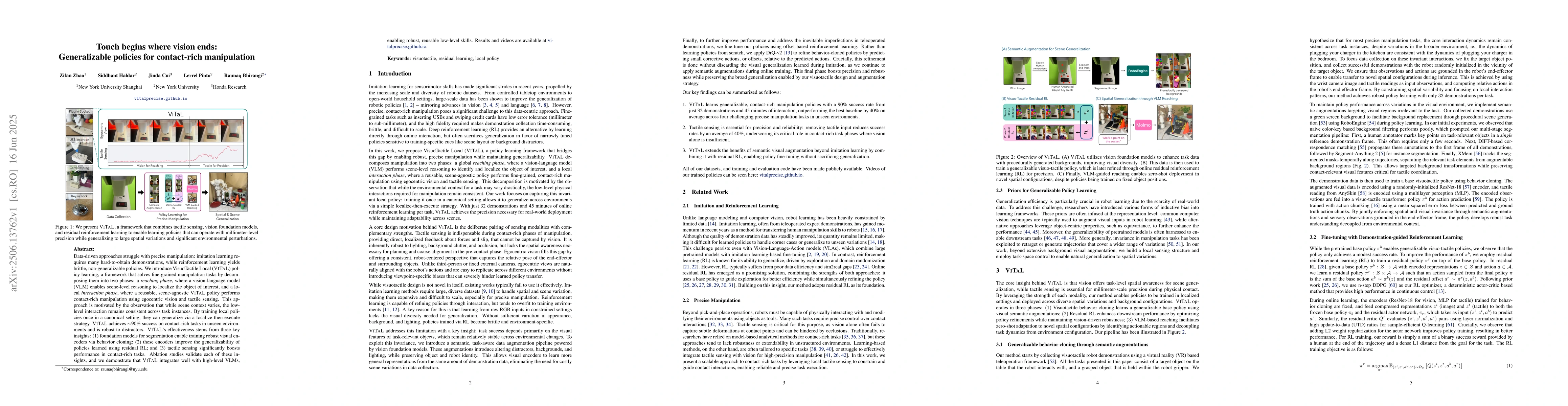 The research introduces VisuoTactile Local (ViTaL) policy learning, a framework that decomposes fine-grained manipulation tasks into a reaching phase guided by a vision-language model (VLM) for scene-level reasoning and localization, and a local interaction phase using egocentric vision and tactile sensing for contact-rich manipulation. The approach leverages foundation models for segmentation to train robust visual encoders via behavior cloning, and these encoders improve the generalizability of policies learned using residual reinforcement learning (RL). Tactile sensing significantly boosts performance in contact-rich tasks.