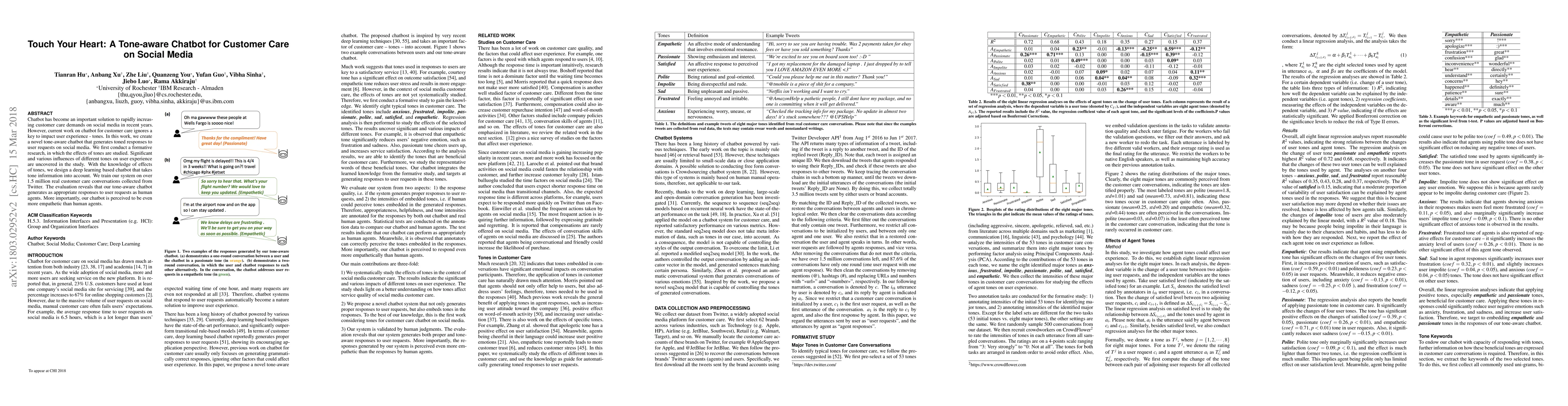 This paper introduces a novel tone-aware chatbot designed to improve customer care on social media by generating responses that match the tone of user requests. The study reveals significant impacts of tone on user experience, leading to the development of a deep learning-based system trained on over 1.5 million real conversations, which is found to be as appropriate and more empathetic than human agents.