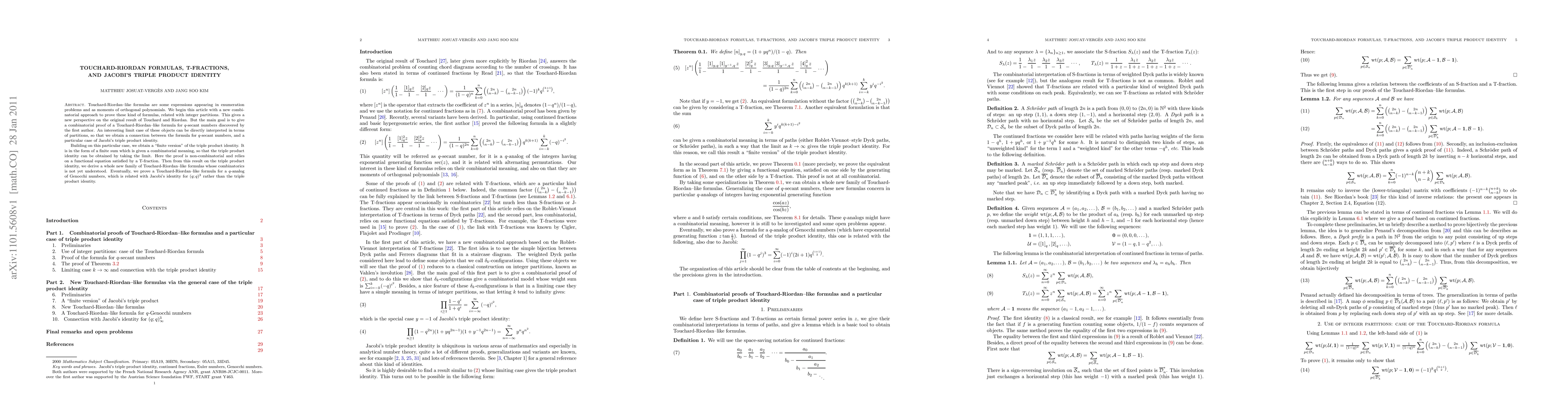 Touchard-Riordan-like formulas are some expressions appearing in enumeration problems and as moments of orthogonal polynomials. We begin this article with a new combinatorial approach to prove these kind of formulas, related with integer partitions. This gives a new perspective on the original result of Touchard and Riordan. But the main goal is to give a combinatorial proof of a Touchard-Riordan--like formula for q-secant numbers discovered by the first author. An interesting limit case of these objects can be directly interpreted in terms of partitions, so that we obtain a connection between the formula for q-secant numbers, and a particular case of Jacobi's triple product identity. Building on this particular case, we obtain a "finite version" of the triple product identity. It is in the form of a finite sum which is given a combinatorial meaning, so that the triple product identity can be obtained by taking the limit. Here the proof is non-combinatorial and relies on a functional equation satisfied by a T-fraction. Then from this result on the triple product identity, we derive a whole new family of Touchard-Riordan--like formulas whose combinatorics is not yet understood. Eventually, we prove a Touchard-Riordan--like formula for a q-analog of Genocchi numbers, which is related with Jacobi's identity for (q;q)^3 rather than the triple product identity.