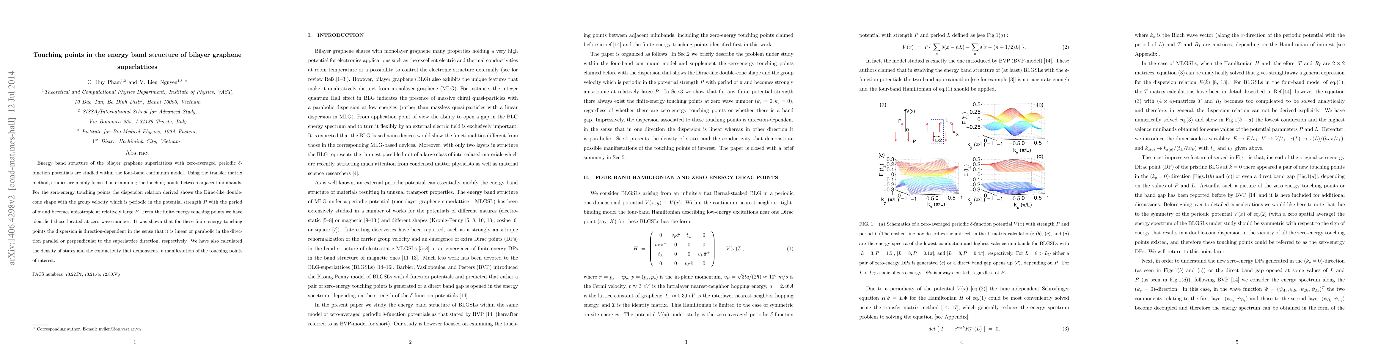 This paper investigates the energy band structure of bilayer graphene superlattices under periodic potentials, identifying touching points between minibands using the transfer matrix method. The study reveals Dirac-like behavior at zero-energy points and direction-dependent dispersion at finite-energy points, with significant implications for density of states and conductivity.