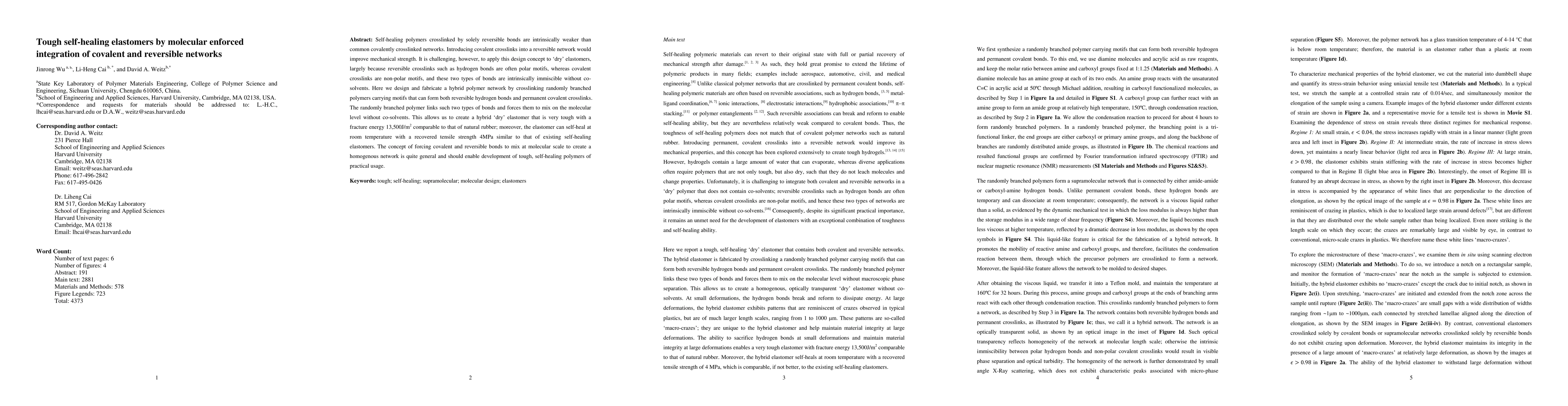 This paper presents a hybrid polymer network combining reversible hydrogen bonds and covalent crosslinks in dry elastomers, achieving high mechanical strength and self-healing capability without co-solvents. The resulting elastomer exhibits toughness comparable to natural rubber and self-healing properties at room temperature.