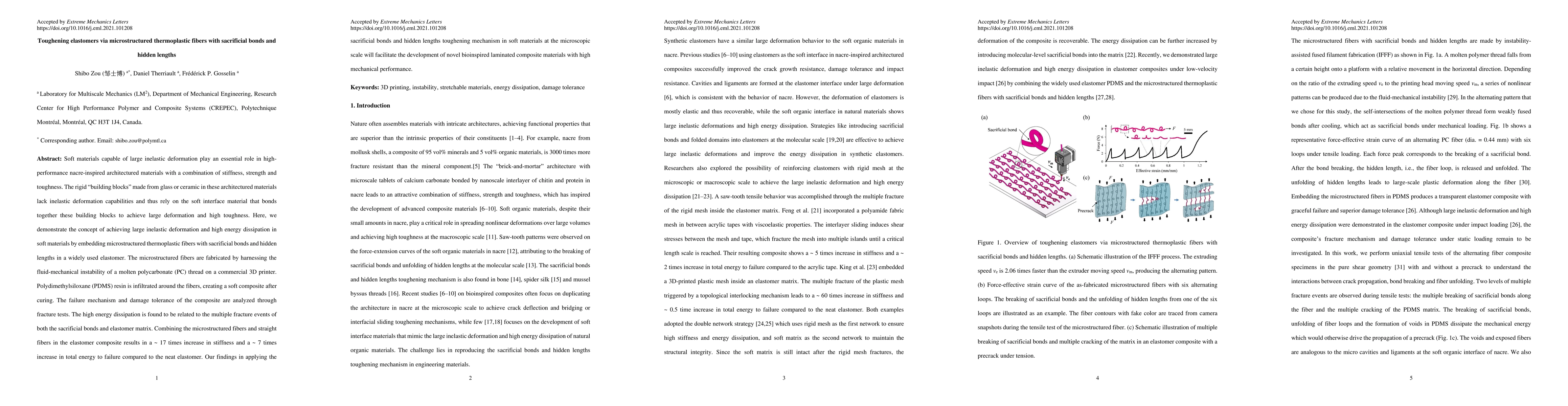 This paper explores toughening elastomers by embedding microstructured thermoplastic fibers with sacrificial bonds and hidden lengths, achieving significant increases in stiffness and energy dissipation. The fibers, created via 3D printing of molten polycarbonate, are embedded in a PDMS matrix, resulting in a composite that shows a 17-fold increase in stiffness and 7-fold increase in energy to failure compared to the base elastomer.