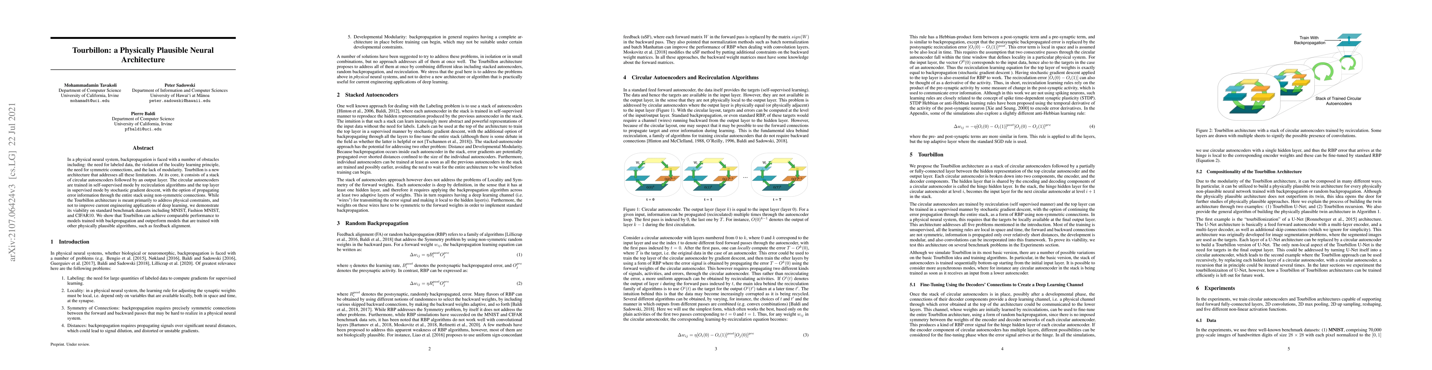 In a physical neural system, backpropagation is faced with a number of obstacles including: the need for labeled data, the violation of the locality learning principle, the need for symmetric connections, and the lack of modularity. Tourbillon is a new architecture that addresses all these limitations. At its core, it consists of a stack of circular autoencoders followed by an output layer. The circular autoencoders are trained in self-supervised mode by recirculation algorithms and the top layer in supervised mode by stochastic gradient descent, with the option of propagating error information through the entire stack using non-symmetric connections. While the Tourbillon architecture is meant primarily to address physical constraints, and not to improve current engineering applications of deep learning, we demonstrate its viability on standard benchmark datasets including MNIST, Fashion MNIST, and CIFAR10. We show that Tourbillon can achieve comparable performance to models trained with backpropagation and outperform models that are trained with other physically plausible algorithms, such as feedback alignment.