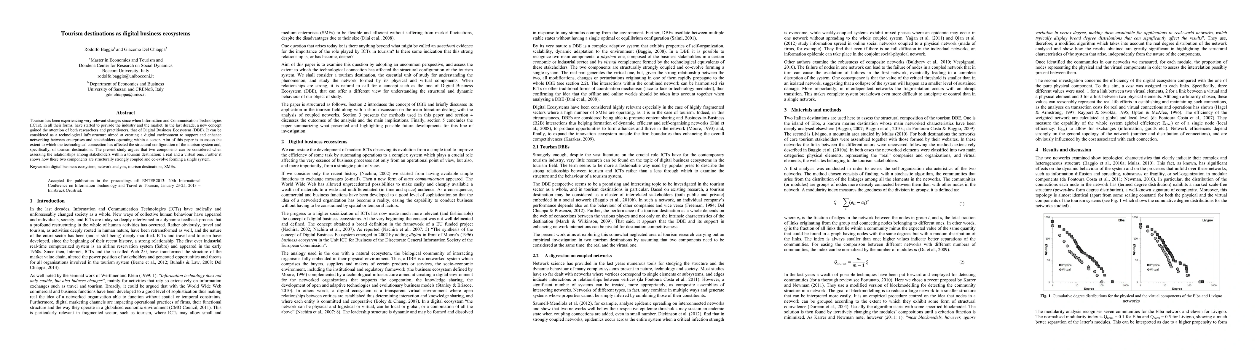 This paper explores the impact of digital business ecosystems on tourism destinations' structure, identifying two key components: real and virtual stakeholder relationships. It concludes these components are interconnected and co-evolve as a single system, significantly influencing tourism destinations.