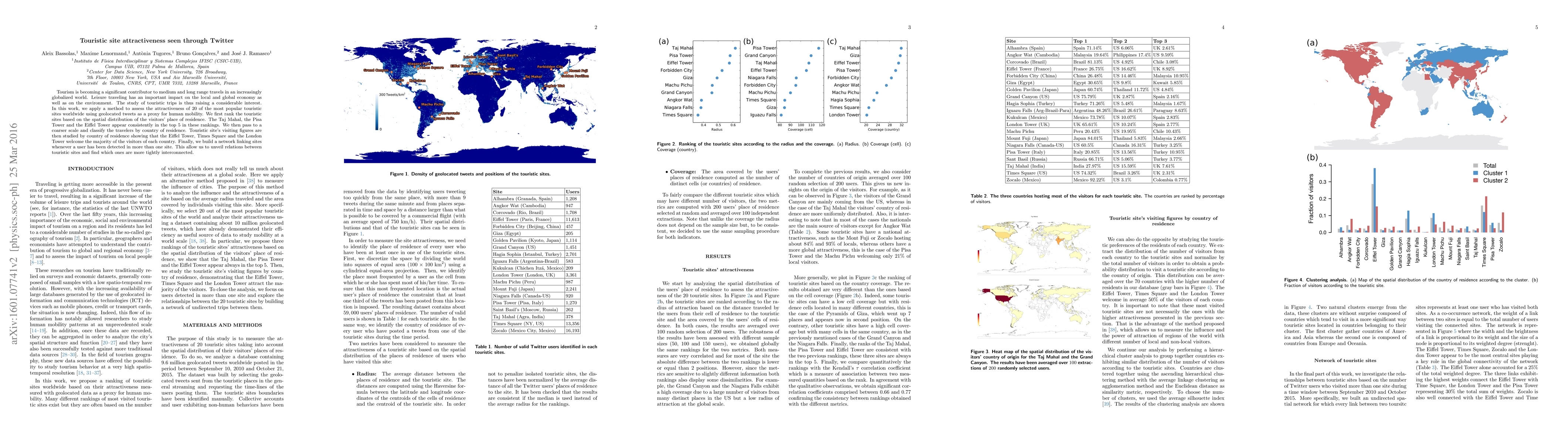 Tourism is becoming a significant contributor to medium and long range travels in an increasingly globalized world. Leisure traveling has an important impact on the local and global economy as well as on the environment. The study of touristic trips is thus raising a considerable interest. In this work, we apply a method to assess the attractiveness of 20 of the most popular touristic sites worldwide using geolocated tweets as a proxy for human mobility. We first rank the touristic sites based on the spatial distribution of the visitors' place of residence. The Taj Mahal, the Pisa Tower and the Eiffel Tower appear consistently in the top 5 in these rankings. We then pass to a coarser scale and classify the travelers by country of residence. Touristic site's visiting figures are then studied by country of residence showing that the Eiffel Tower, Times Square and the London Tower welcome the majority of the visitors of each country. Finally, we build a network linking sites whenever a user has been detected in more than one site. This allow us to unveil relations between touristic sites and find which ones are more tightly interconnected.