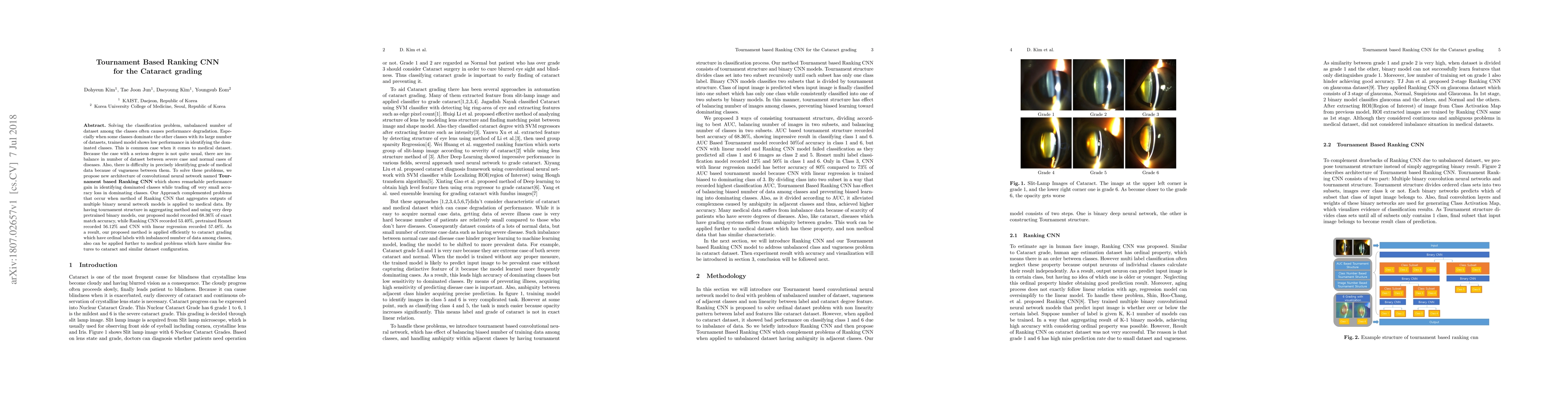 Solving the classification problem, unbalanced number of dataset among the classes often causes performance degradation. Especially when some classes dominate the other classes with its large number of datasets, trained model shows low performance in identifying the dominated classes. This is common case when it comes to medical dataset. Because the case with a serious degree is not quite usual, there are imbalance in number of dataset between severe case and normal cases of diseases. Also, there is difficulty in precisely identifying grade of medical data because of vagueness between them. To solve these problems, we propose new architecture of convolutional neural network named Tournament based Ranking CNN which shows remarkable performance gain in identifying dominated classes while trading off very small accuracy loss in dominating classes. Our Approach complemented problems that occur when method of Ranking CNN that aggregates outputs of multiple binary neural network models is applied to medical data. By having tournament structure in aggregating method and using very deep pretrained binary models, our proposed model recorded 68.36% of exact match accuracy, while Ranking CNN recorded 53.40%, pretrained Resnet recorded 56.12% and CNN with linear regression recorded 57.48%. As a result, our proposed method is applied efficiently to cataract grading which have ordinal labels with imbalanced number of data among classes, also can be applied further to medical problems which have similar features to cataract and similar dataset configuration.