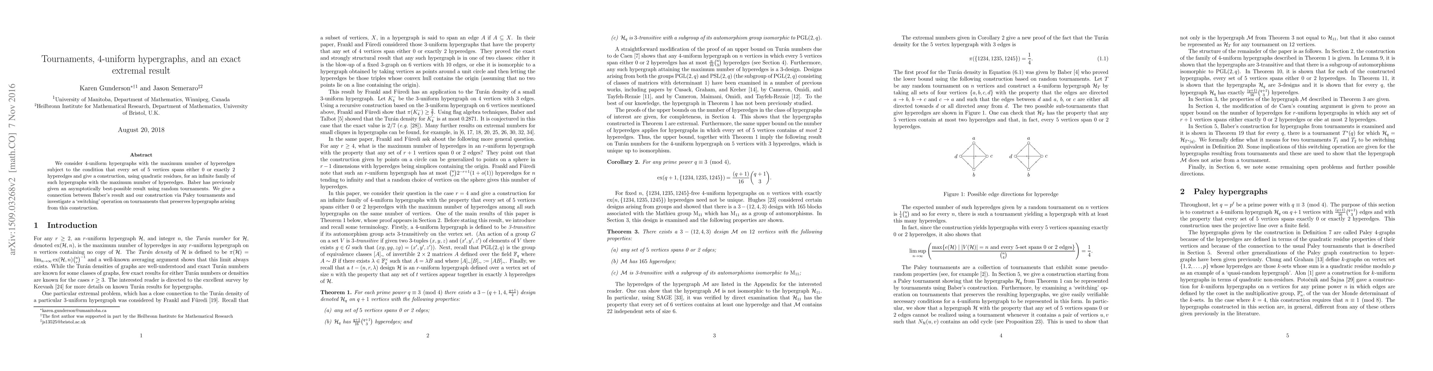 This paper constructs an infinite family of 4-uniform hypergraphs maximizing the number of hyperedges under specific vertex conditions, using quadratic residues and Paley tournaments. It connects this construction to Baber's asymptotically optimal result via a 'switching' operation on tournaments.