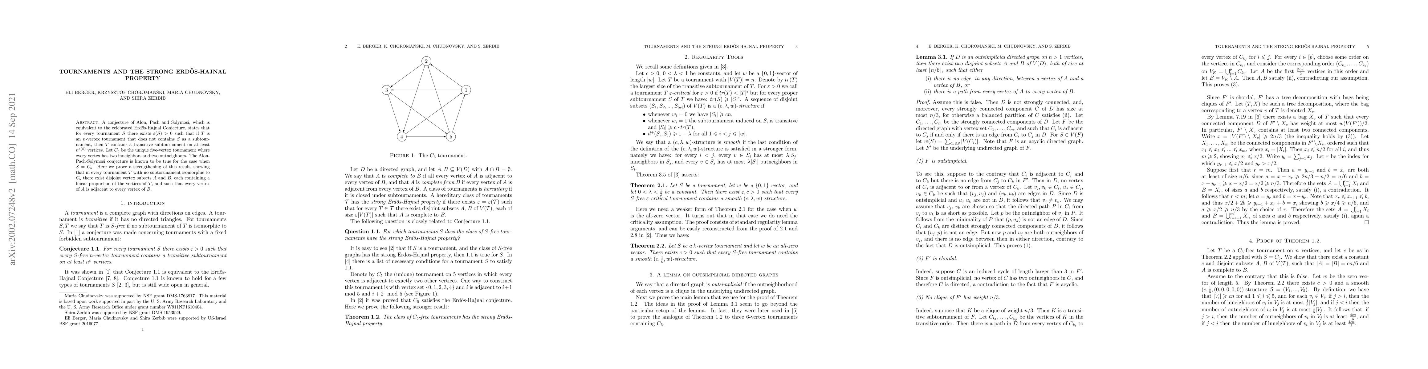 A conjecture of Alon, Pach and Solymosi, which is equivalent to the celebrated Erd\H{o}s-Hajnal Conjecture, states that for every tournament $S$ there exists $\epsilon(S)>0$ such that if $T$ is an $n$-vertex tournament that does not contains $S$ as a subtournament, then $T$ contains a transitive subtournament on at least $n^{\epsilon(S)}$ vertices. Let $C_5$ be the unique five-vertex tournament where every vertex has two inneighbors and two outneighbors. The Alon-Pach-Solymosi conjecture is known to be true for the case when $S=C_5$. Here we prove a strengthening of this result, showing that in every tournament $T$ with no subtorunament isomorphic to $C_5$ there exist disjoint vertex subsets $A$ and $B$, each containing a linear proportion of the vertices of $T$, and such that every vertex of $A$ is adjacent to every vertex of $B$.