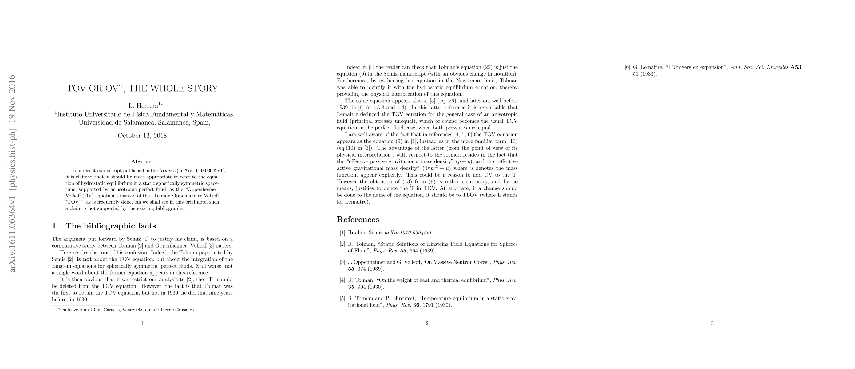In a recent manuscript published in the Arxives (arXiv:1610.03049v1), it is claimed that it should be more appropriate to refer to the equation of hydrostatic equilibrium in a static spherically symmetric spacetime, supported by an isotropic perfect fluid, as the "Oppenheimer-Volkoff (OV) equation", instead of the "Tolman-Oppenheimer-Volkoff (TOV)", as is frequently done. As we shall see in this brief note, such a claim is not supported by the existing bibliography.