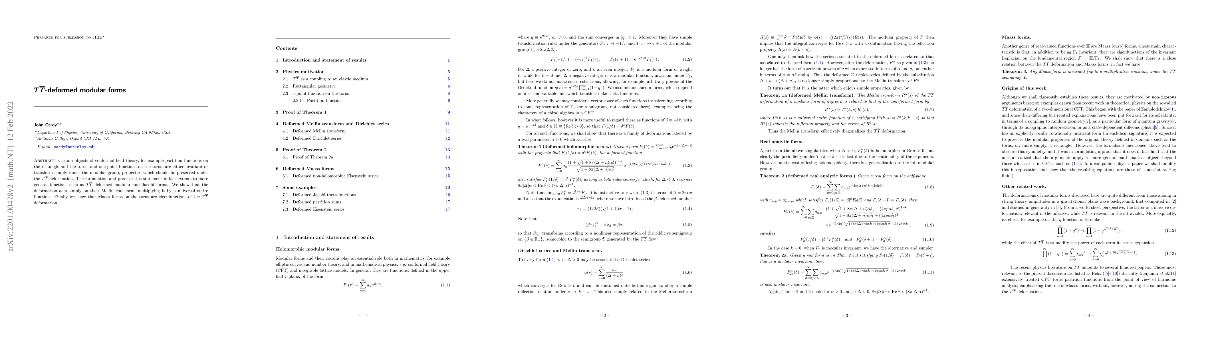 This paper explores how $T\overline T$ deformation affects modular and Jacobi forms, showing that their Mellin transforms are multiplied by a universal entire function. Additionally, it demonstrates that Maass forms on the torus are eigenfunctions of this deformation.