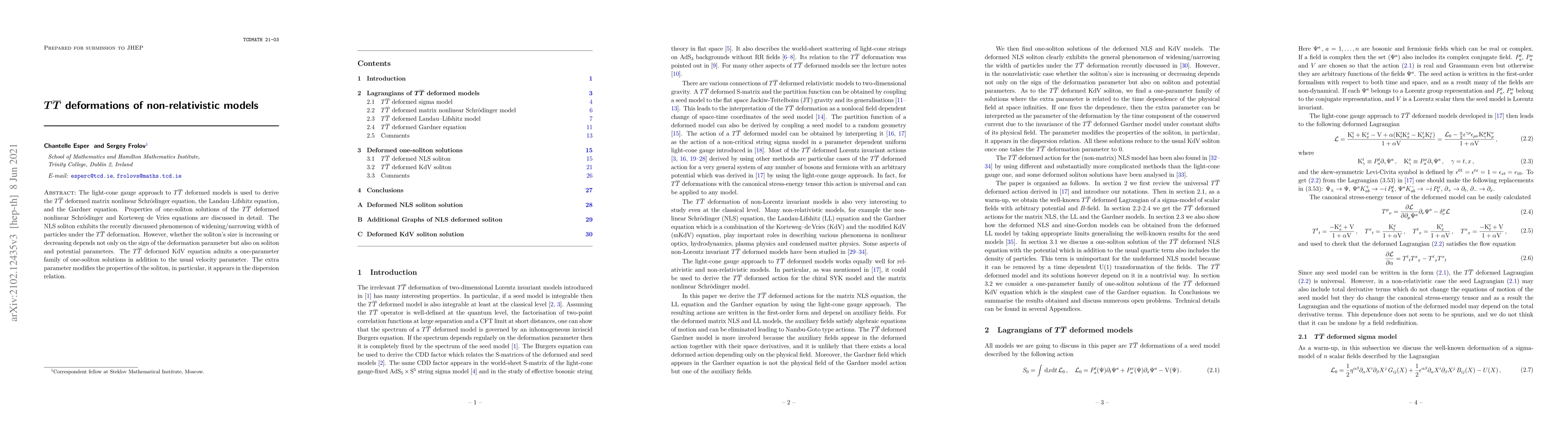 The paper explores $T\overline{T}$ deformations in nonrelativistic models, deriving equations such as the $T\overline{T}$ deformed matrix nonlinear Schrödinger, Landau-Lifshitz, and Gardner equations. It investigates one-soliton solutions, revealing that $T\overline{T}$ deformation can either widen or narrow soliton widths, depending on various parameters, and introduces an extra parameter affecting the soliton properties in the deformed KdV equation.