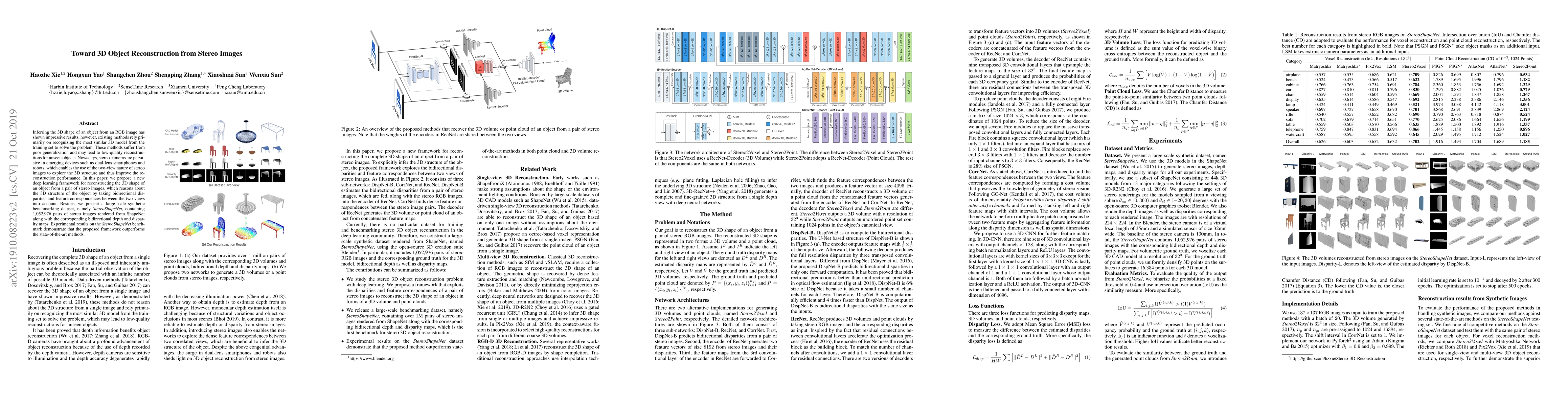 This paper proposes a deep learning framework for reconstructing 3D object shapes from stereo images, leveraging bidirectional disparities and feature correspondences. It introduces a new synthetic dataset, StereoShapeNet, and shows superior performance compared to existing methods on this benchmark.