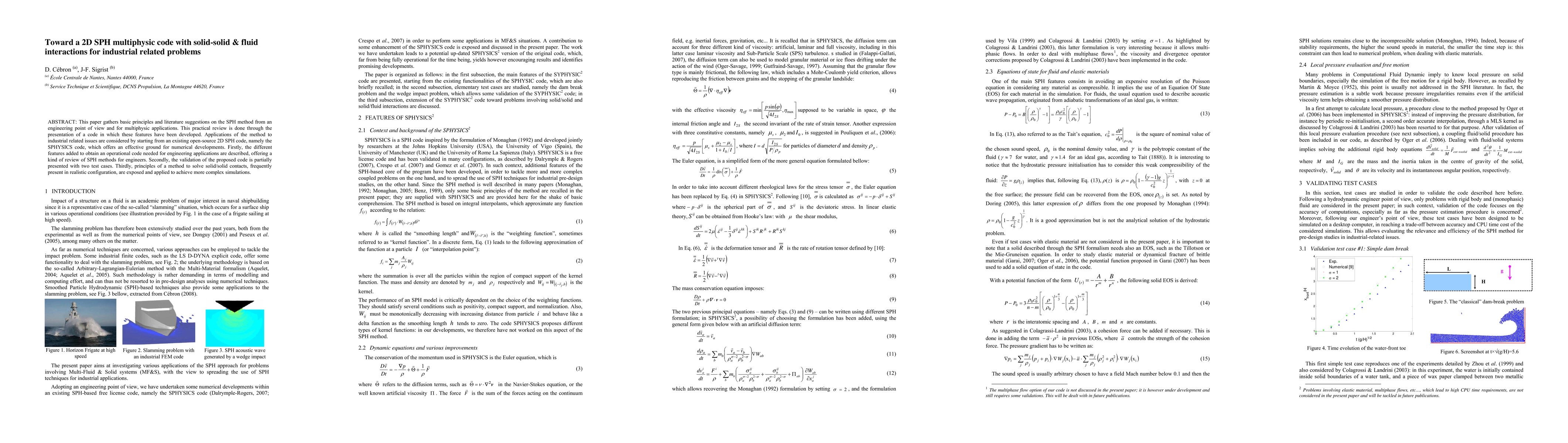 This paper enhances the existing 2D SPHYSICS code to create SPHYSIC2, incorporating solid-solid and fluid interactions for industrial simulations, validated with "dam break" and "wedge entry" tests, and outlines future developments for broader applications.