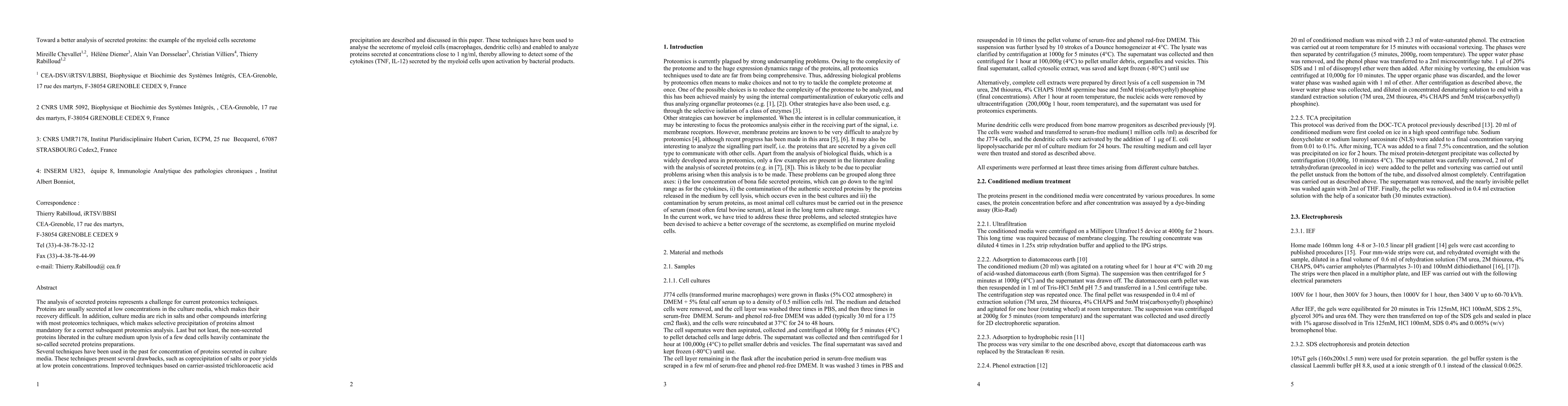 The analysis of secreted proteins represents a challenge for current proteomics techniques. Proteins are usually secreted at low concentrations in the culture media, which makes their recovery difficult. In addition, culture media are rich in salts and other compounds interfering with most proteomics techniques, which makes selective precipitation of proteins almost mandatory for a correct subsequent proteomics analysis. Last but not least, the non-secreted proteins liberated in the culture medium upon lysis of a few dead cells heavily contaminate the so-called secreted proteins preparations. Several techniques have been used in the past for concentration of proteins secreted in culture media. These techniques present several drawbacks, such as coprecipitation of salts or poor yields at low protein concentrations. Improved techniques based on carrier-assisted trichloroacetic acid precipitation are described and discussed in this paper. These techniques have been used to analyse the secretome of myeloid cells (macrophages, dendritic cells) and enabled to analyze proteins secreted at concentrations close to 1 ng/ml, thereby allowing to detect some of the cytokines (TNF, IL-12) secreted by the myeloid cells upon activation by bacterial products.