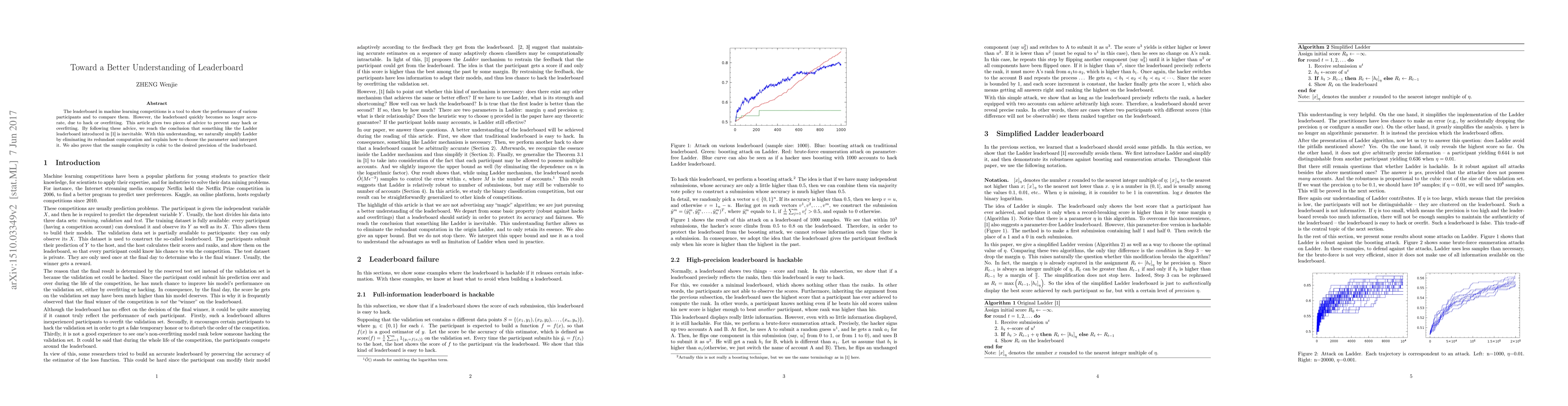 This paper discusses strategies to improve the accuracy and reliability of machine learning competition leaderboards, addressing issues like hacking and overfitting. It proposes simplifications to the Ladder leaderboard and proves its sample complexity, concluding that such refined leaderboards are essential for fair competition.
