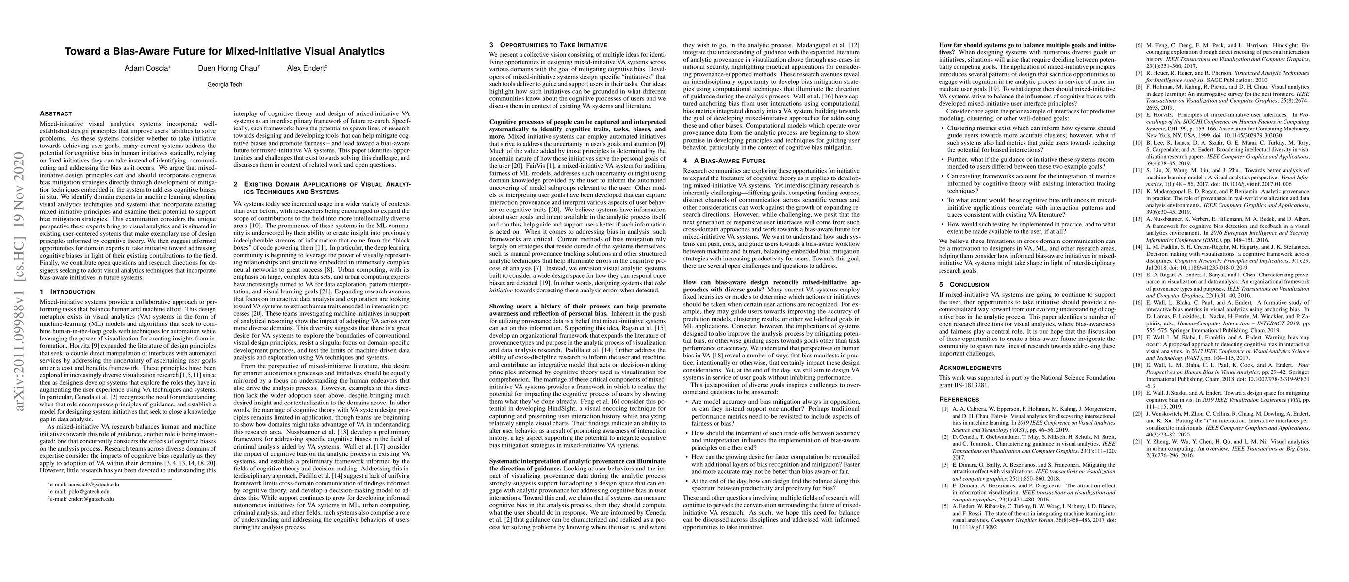 This paper argues for integrating cognitive bias mitigation strategies into mixed-initiative visual analytics systems, proposing that these systems should embed techniques to address biases dynamically. It examines how domain experts in machine learning can contribute to developing such systems and suggests future research directions for bias-aware visual analytics.