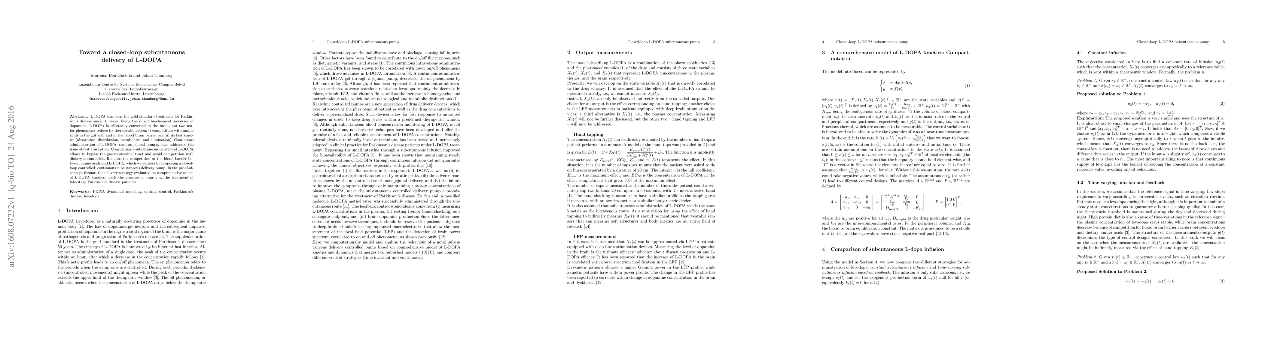 Researchers propose a closed-loop subcutaneous delivery system for L-DOPA to improve treatment of late-stage Parkinson's disease by bypassing gastrointestinal competition and utilizing continuous delivery for faster absorption.