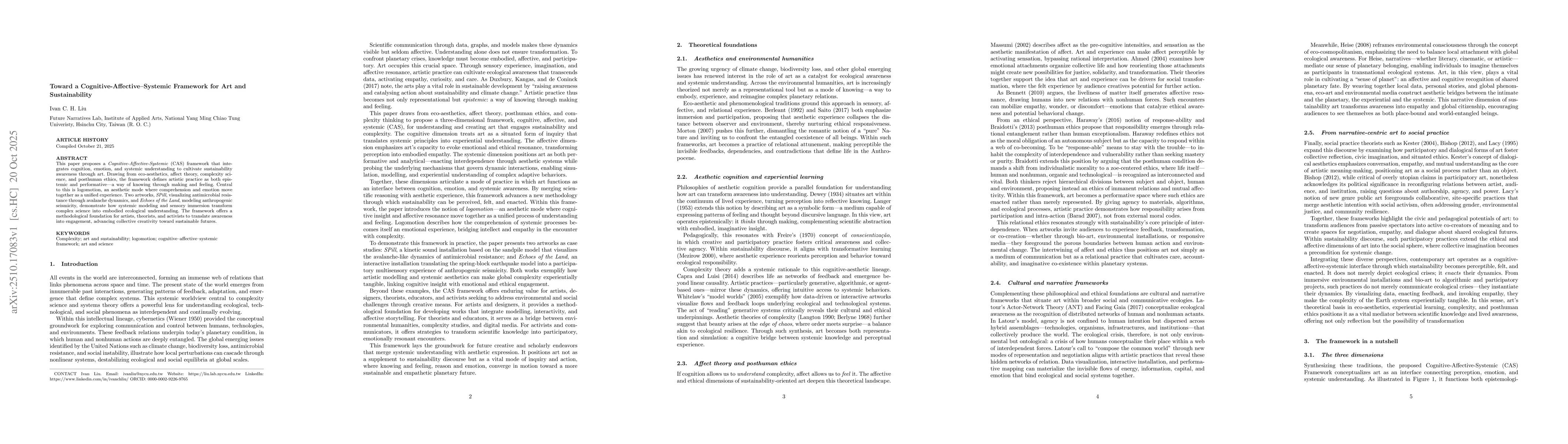 This paper proposes a ognitive-Affective-Systemic (CAS) framework that integrates cognition, emotion, and systemic understanding to cultivate sustainability awareness through art. Drawing from eco-aesthetics, affect theory, complexity science, and posthuman ethics, the framework defines artistic practice as both epistemic and performative--a way of knowing through making and feeling. Central to this is logomotion, an aesthetic mode where comprehension and emotion move together as a unified experience. Two artworks, SPill, visualizing antimicrobial resistance through avalanche dynamics, and Echoes of the Land, modeling anthropogenic seismicity, demonstrate how systemic modeling and sensory immersion transform complex science into embodied ecological understanding. The framework offers a methodological foundation for artists, theorists, and activists to translate awareness into engagement, advancing collective creativity toward sustainable futures.