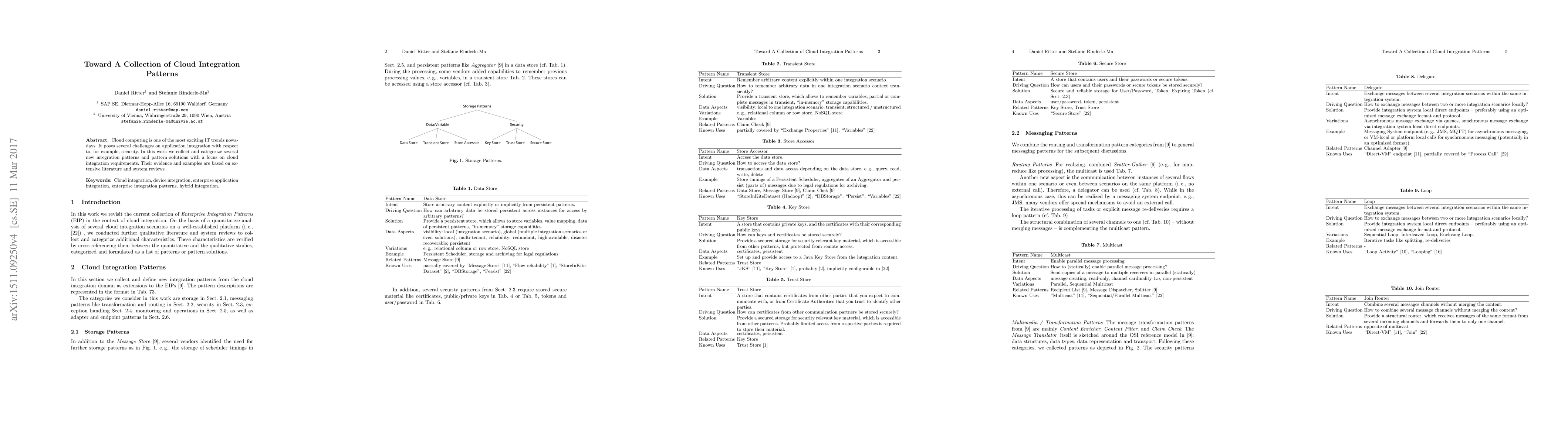 Cloud computing is one of the most exciting IT trends nowadays. It poses several challenges on application integration with respect to, for example, security. In this work we collect and categorize several new integration patterns and pattern solutions with a focus on cloud integration requirements. Their evidence and examples are based on extensive literature and system reviews.