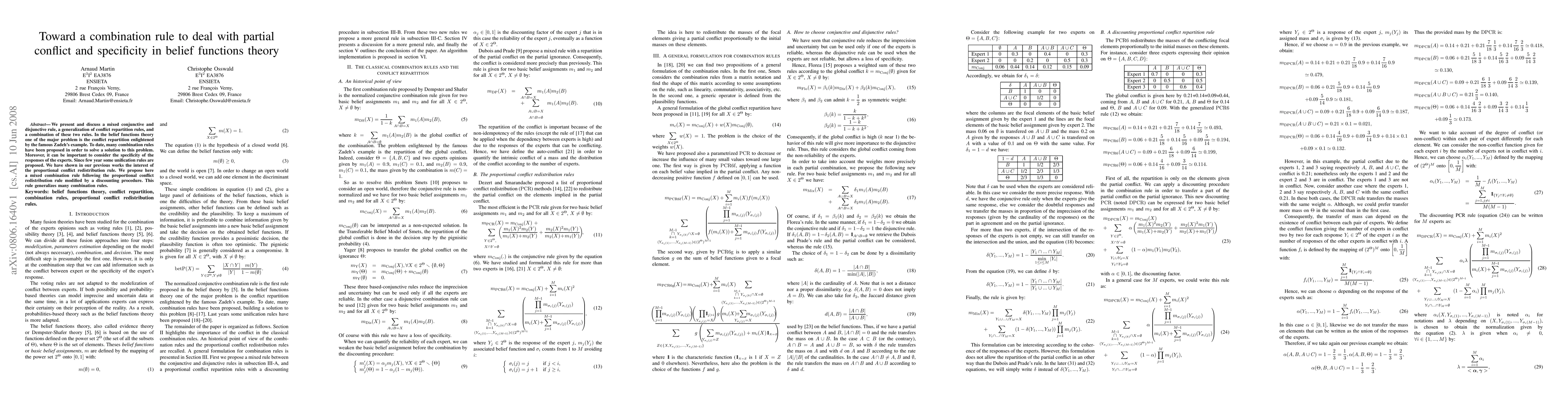 We present and discuss a mixed conjunctive and disjunctive rule, a generalization of conflict repartition rules, and a combination of these two rules. In the belief functions theory one of the major problem is the conflict repartition enlightened by the famous Zadeh's example. To date, many combination rules have been proposed in order to solve a solution to this problem. Moreover, it can be important to consider the specificity of the responses of the experts. Since few year some unification rules are proposed. We have shown in our previous works the interest of the proportional conflict redistribution rule. We propose here a mixed combination rule following the proportional conflict redistribution rule modified by a discounting procedure. This rule generalizes many combination rules.