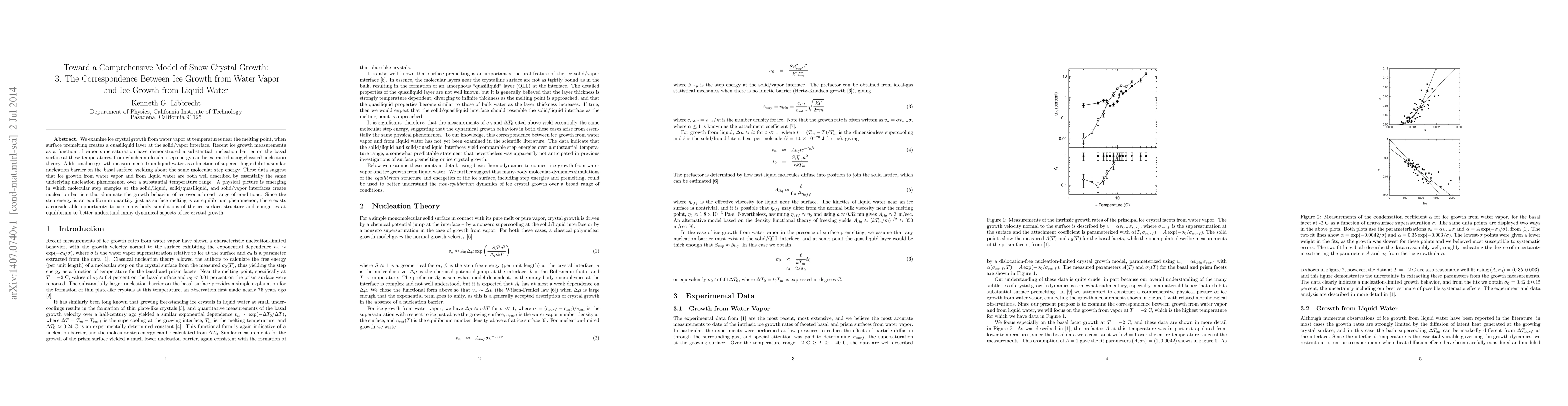 We examine ice crystal growth from water vapor at temperatures near the melting point, when surface premelting creates a quasiliquid layer at the solid/vapor interface. Recent ice growth measurements as a function of vapor supersaturation have demonstrated a substantial nucleation barrier on the basal surface at these temperatures, from which a molecular step energy can be extracted using classical nucleation theory. Additional ice growth measurements from liquid water as a function of supercooling exhibit a similar nucleation barrier on the basal surface, yielding about the same molecular step energy. These data suggest that ice growth from water vapor and from liquid water are both well described by essentially the same underlying nucleation phenomenon over a substantial temperature range. A physical picture is emerging in which molecular step energies at the solid/liquid, solid/quasiliquid, and solid/vapor interfaces create nucleation barriers that dominate the growth behavior of ice over a broad range of conditions. Since the step energy is an equilibrium quantity, just as surface melting is an equilibrium phenomenon, there exists a considerable opportunity to use many-body simulations of the ice surface structure and energetics at equilibrium to better understand many dynamical aspects of ice crystal growth.