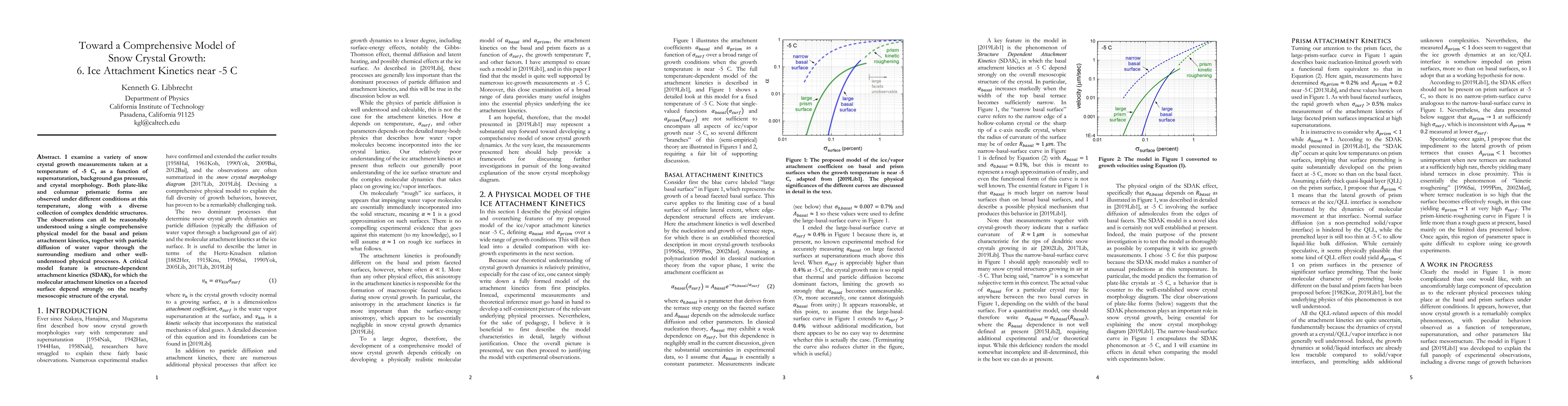 This paper investigates snow crystal growth at -5°C, focusing on attachment kinetics, supersaturation, and gas pressure effects. It proposes a comprehensive model incorporating structure-dependent attachment kinetics (SDAK) to explain the formation of various crystal shapes, including plates, columns, and dendrites.