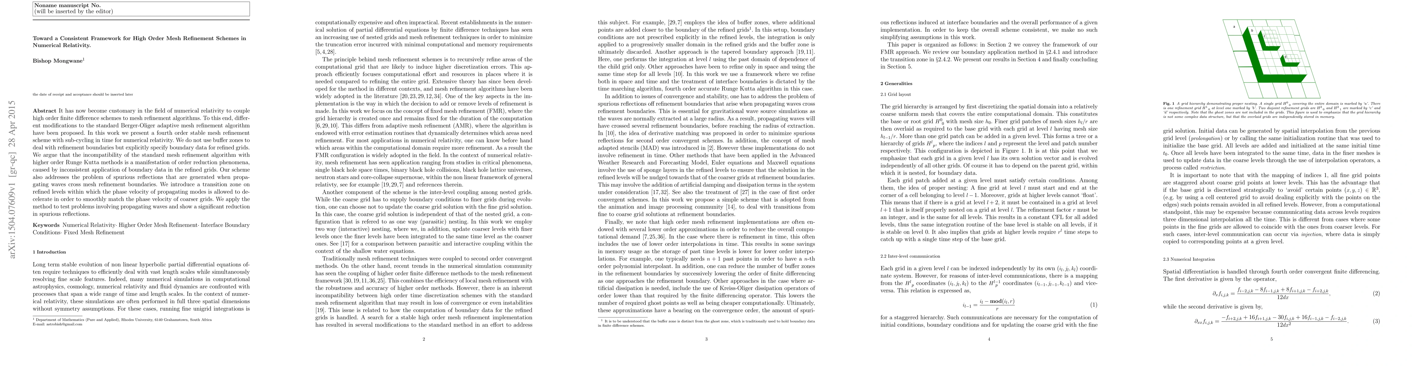 This paper presents a fourth-order stable mesh refinement scheme for numerical relativity that avoids buffer zones and explicitly specifies boundary data, addressing order reduction and spurious reflections. The method introduces a transition zone to smooth phase velocity matching across refinement boundaries, significantly reducing spurious reflections in test problems.