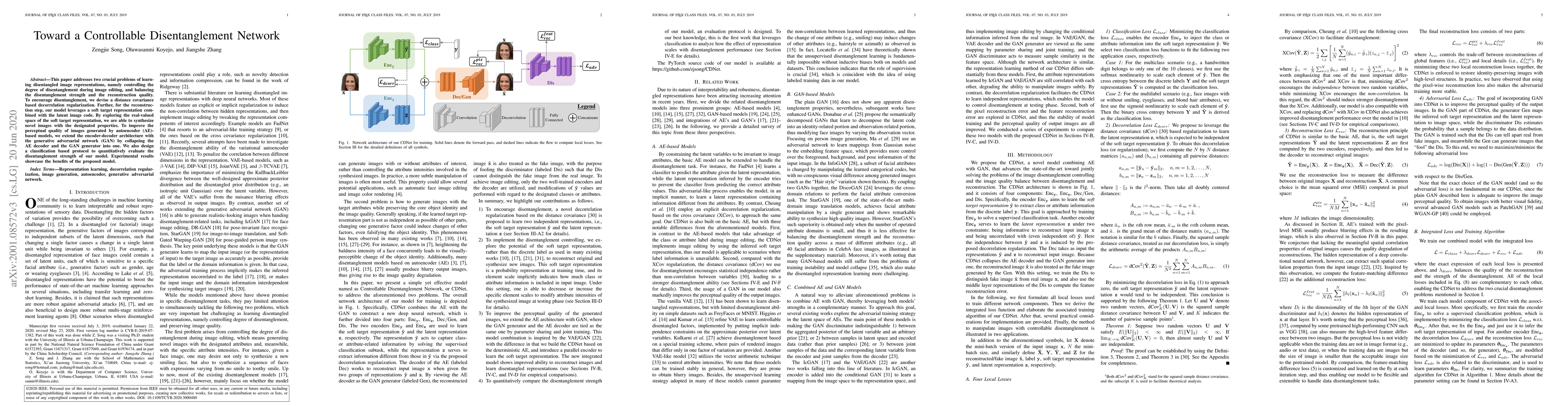 This paper addresses two crucial problems of learning disentangled image representations, namely controlling the degree of disentanglement during image editing, and balancing the disentanglement strength and the reconstruction quality. To encourage disentanglement, we devise a distance covariance based decorrelation regularization. Further, for the reconstruction step, our model leverages a soft target representation combined with the latent image code. By exploring the real-valued space of the soft target representation, we are able to synthesize novel images with the designated properties. To improve the perceptual quality of images generated by autoencoder (AE)-based models, we extend the encoder-decoder architecture with the generative adversarial network (GAN) by collapsing the AE decoder and the GAN generator into one. We also design a classification based protocol to quantitatively evaluate the disentanglement strength of our model. Experimental results showcase the benefits of the proposed model.