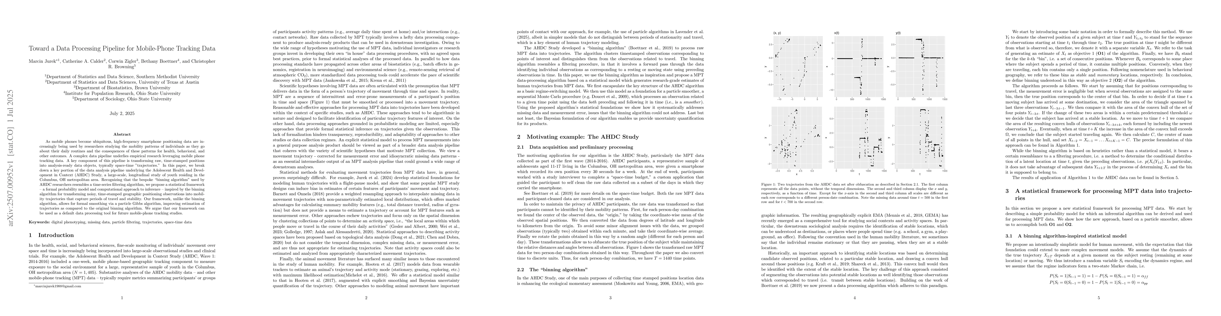 As mobile phones become ubiquitous, high-frequency smartphone positioning data are increasingly being used by researchers studying the mobility patterns of individuals as they go about their daily routines and the consequences of these patterns for health, behavioral, and other outcomes. A complex data pipeline underlies empirical research leveraging mobile phone tracking data. A key component of this pipeline is transforming raw, time-stamped positions into analysis-ready data objects, typically space-time "trajectories." In this paper, we break down a key portion of the data analysis pipeline underlying the Adolescent Health and Development in Context (AHDC) Study, a large-scale, longitudinal study of youth residing in the Columbus, OH metropolitan area. Recognizing that the bespoke "binning algorithm" used by AHDC researchers resembles a time-series filtering algorithm, we propose a statistical framework - a formal probability model and computational approach to inference - inspired by the binning algorithm for transforming noisy, time-stamped geographic positioning observations into mobility trajectories that capture periods of travel and stability. Our framework, unlike the binning algorithm, allows for formal smoothing via a particle Gibbs algorithm, improving estimation of trajectories as compared to the original binning algorithm. We argue that our framework can be used as a default data processing tool for future mobile-phone tracking studies.